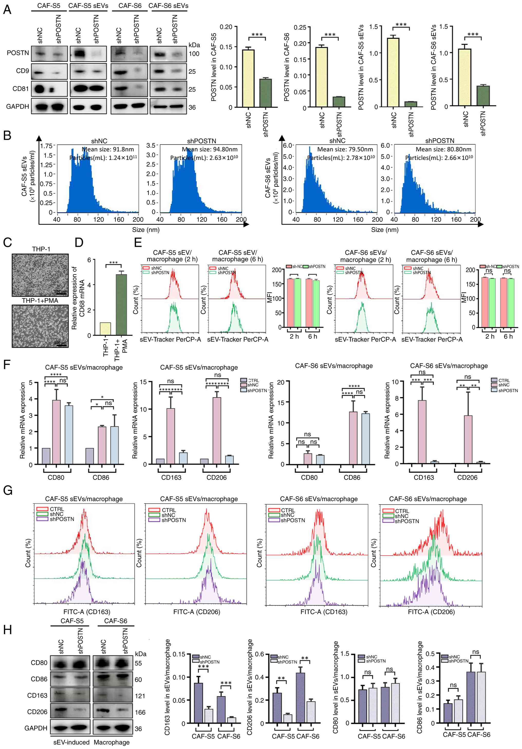 To determine whether sEV-POSTN can induce macrophage polarization, CAF-S5/-S6 stably transfected with shNC and shPOSTN were established and sEVs were isolated by differential ultracentrifugation. The expression of POSTN in CAF-S5/-S6 and their sEVs was markedly reduced by shPOSTN compared with that in the shNC group (Fig. 4A). The mean sizes of sEVs derived from shNC/shPOSTN-transfected CAF-S5/-S6 were ~95 and 80 nm, respectively and their particles concentration were ~1.9×1010 and 2.7×1010 sEV/1 ml CM, respectively (Fig. 4B). Human THP-1 cells were incubated with PMA (50 ng/ml) for 48 h to induce differentiation into M0 macrophages, which exhibited the corresponding adherent morphology (Fig. 4C) and highly expressed the macrophage marker CD68 (P<0.001; Fig. 4D). Flow cytometry revealed that macrophages exhibited no significant difference in their uptake of PKH26-labeled sEVs derived from shNC/shPOSTN-transfected CAF-S5/-S6 (Fig. 4E). RT-qPCR assay revealed that the M2 macrophage markers CD163 and CD206 were markedly downregulated, whereas the M1 macrophage markers CD80 and CD86 remained unchanged, after co-incubation with sEVs derived from shPOSTN-transfected CAF-S5/-S6 compared with those from sEVs derived from shNC-transfected CAF-S5/-S6 (P<0.01; Fig. 4F). Flow cytometry confirmed that the expression levels of M2 macrophage markers (CD163 and CD206) were markedly reduced in macrophages treated with sEVs derived from POSTN-knockdown CAF-S5/-S6 (Fig. 4G). Furthermore, the expression levels of M2 macrophage markers (CD163 and CD206) were markedly downregulated in macrophages treated with sEVs derived from shPOSTN-transfected CAF-S5/-S6 compared with those treated with sEVs derived from shNC-transfected CAF-S5/S6 (Fig. 4H). However, the expression of M1 macrophage markers (CD80 and CD86) showed no significant difference in macrophages treated with sEVs derived from shNC/shPOSTN-transfected CAF-S5/-S6 (Fig. 4H).