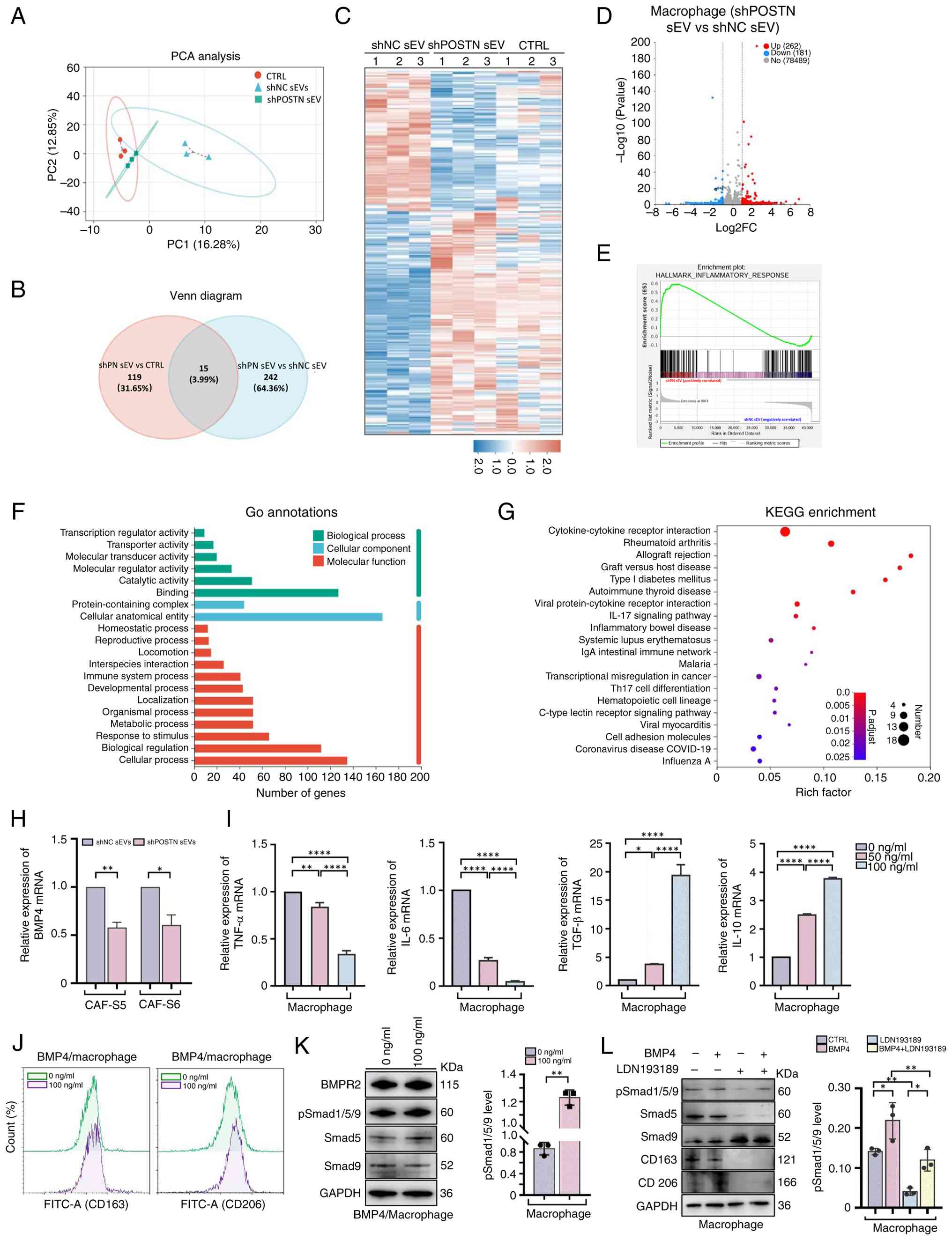 To further investigate the mechanism by which POSTN regulates THP-1-derived macrophages M2 polarization, RNA sequencing was performed on THP-1-derived macrophages stimulated with sEVs derived from CAF-S6 transfected with shPOSTN and shNC. PCA was employed to assess transcriptomics profiles, revealing a clear distinction between macrophages treated with shPOSTN sEVs and CTRL or shNC sEVs (Fig. 5A). A Venn diagram revealed 15 shared genes and 242 unique genes between macrophages treated with shPOSTN sEVs and shNC sEVs (Fig. 5B). Furthermore, a heatmap showed significant upregulation and downregulation of genes in macrophages stimulated with sEVs derived from CAF-S6 transfected with shPOSTN compared with those treated with sEVs derived from CAF-S6 transfected with shNC (Fig. 5C). A volcano plot identified 443 DEGs, including 262 upregulated and 181 downregulated genes, in macrophages treated with shPOSTN sEVs compared with those treated with shNC sEVs (Fig. 5D). Among the top DEGs, BMP4 was identified as a critical growth factor that fosters a pro-tumoral immune environment by polarizing macrophages toward an M2-like phenotype, thereby promoting tumor growth (49).