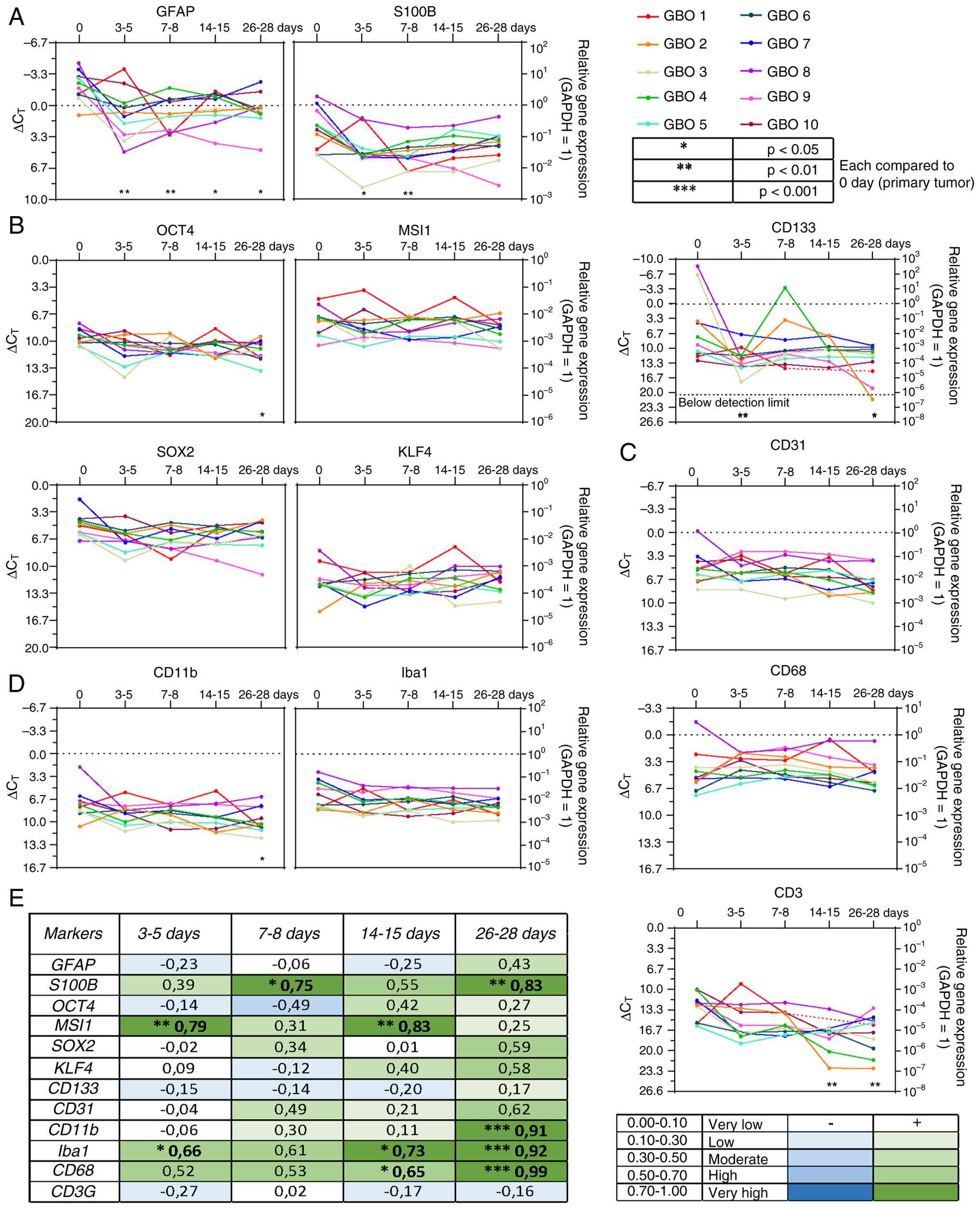 To analyze gene expression levels of glial structural proteins, proliferation marker, specific markers for GSCs, immune and endothelial cells, as well as cytokines and chemokines during the in vitro cultivation of 10 different GBO preparations over time, RT-qPCR was employed. For each GBO preparation, RNA isolation was performed at five different time points using TRIzol (Invitrogen; Thermo Fisher Scientific, Inc.), and cDNA was then synthesized as previously described by Hellmold et al (2025) (27). Each cDNA sample was also analyzed for glyceraldehyde-3-phosphate dehydrogenase (GAPDH), serving as an internal standard. qPCR was performed using TaqMan primer probes (Applied Biosystems; Thermo Fisher Scientific, Inc.). Double determination, including positive and negative controls, was applied. The plate was run in a real-time PCR cycler (QuantStudio5; Applied Biosystems; Thermo Fisher Scientific, Inc.) using the following conditions: 50 cycles, volume of 20 µl, enzyme activation at 95°C for 10 min, denaturation at 95°C for 15 sec, and annealing at 60°C for 1 min. Cycles of threshold (CT) were detected, and the ∆CT values were calculated as CT analyzed gene-CT GAPDH. The applied gene-specific primers and probes are listed in Table SI.