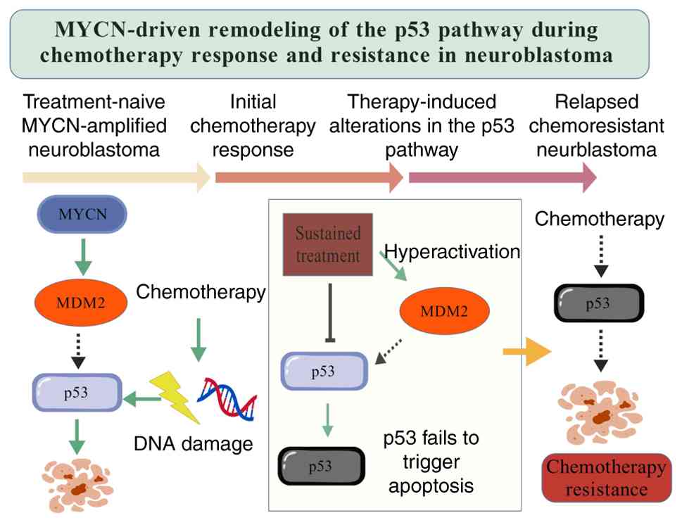 In addition, ALK expression is associated with a poor prognosis and, in synergy with MYCN, accelerates the growth of NB (16–22). As shown in Fig. 1, MYCN-driven oncogenic signaling reshapes the p53 pathway during chemotherapy, contributing to an initial treatment response followed by impaired p53-mediated apoptosis and eventual chemoresistance, providing a mechanistic context in which MYCN-ALK cooperation promotes aggressive disease progression. Gaining a more profound understanding of these genes and their underlying mechanisms is essential for the development of targeted therapeutic strategies.