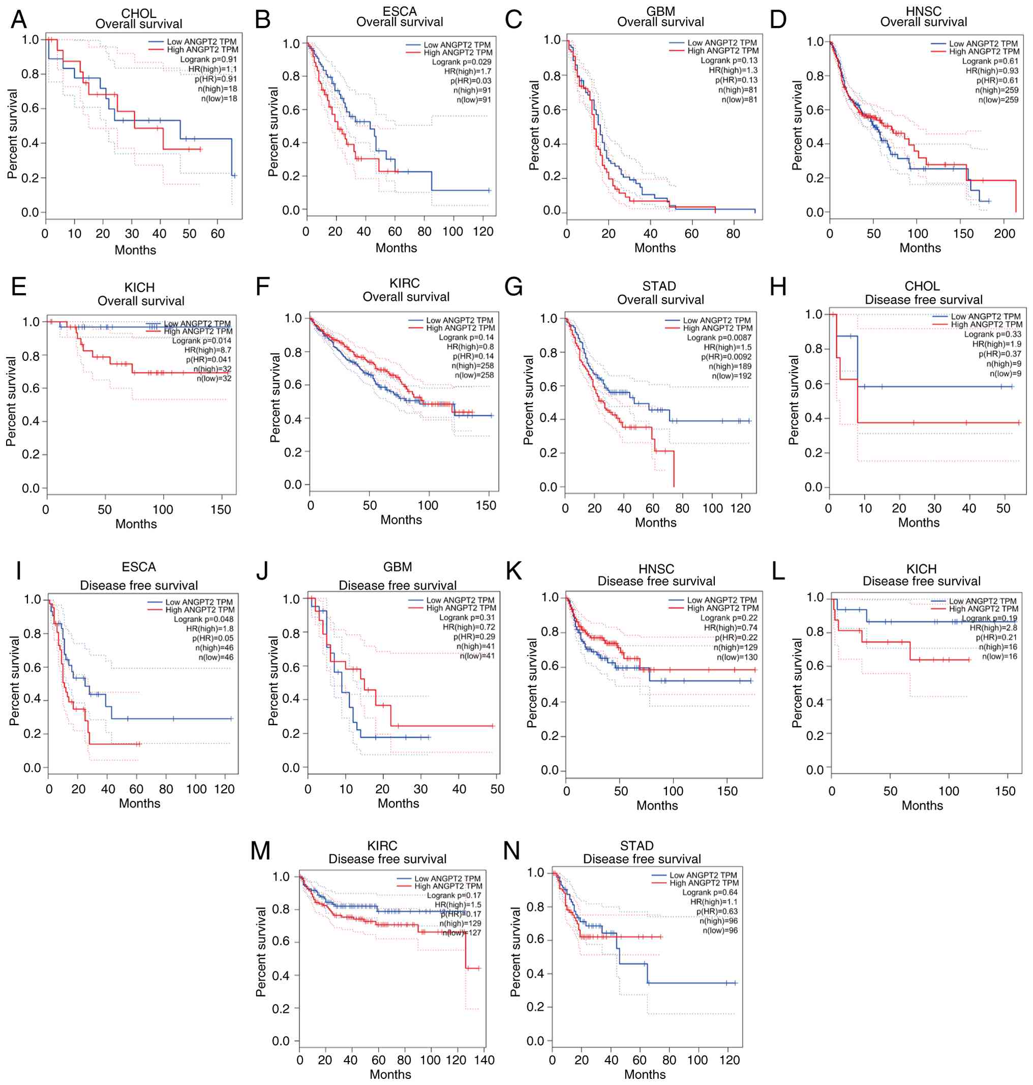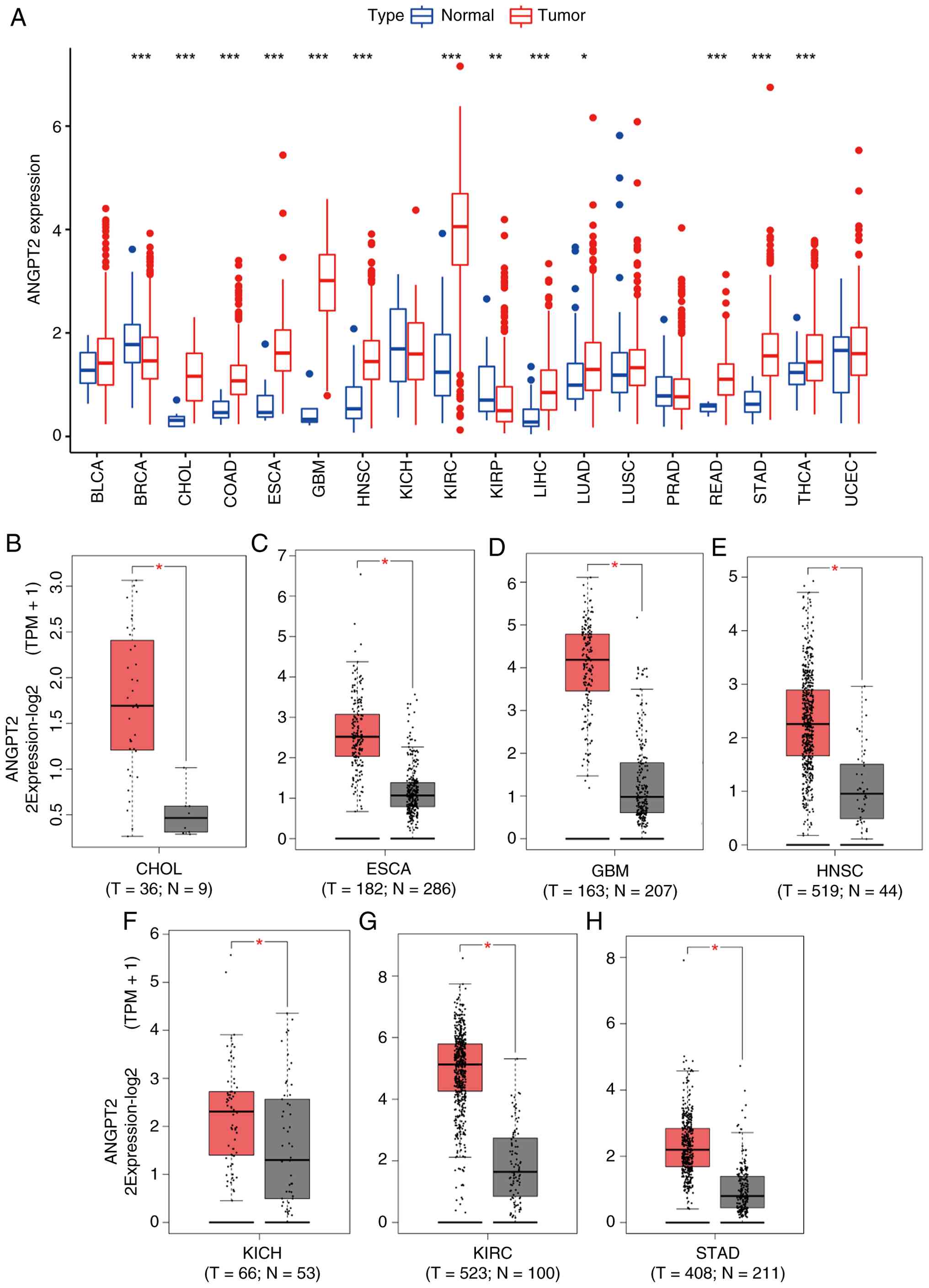 Using the TCGA pan-cancer transcriptomic dataset, the analysis illustrated that ANGPT2 was significantly upregulated in 13 tumor types: BRCA, CHOL, COAD, ESCA, GBM, HNSC, LUAD, KIRC, KIRP, LIHC, READ, STAD and THCA, compared with normal tissues (Fig. 1A). No significant differential expression was detected in BLCA, KICH, LUSC, PRAD and UCEC tumors. Validation via the GEPIA platform further confirmed elevated ANGPT2 expression in CHOL, ESCA, HNSC, GBM, KICH, KIRC and STAD relative to normal tissues (Fig. 1B-H). ANGPT2 was upregulated in CHOL, ESCA, HNSC, GBM, KIRC and STAD, implicating it as a potential driver of oncogenesis and disease progression in these contexts.