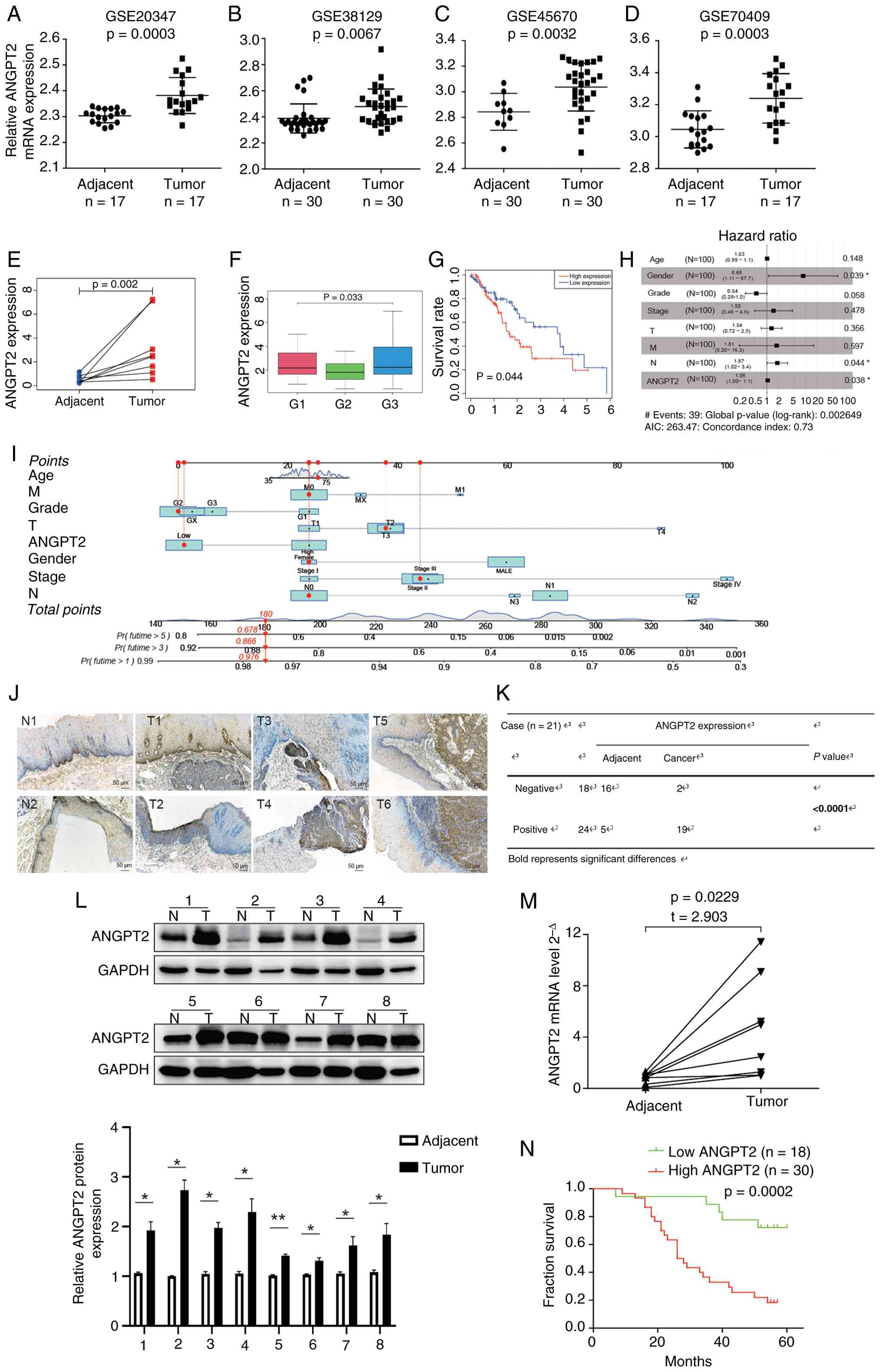 To evaluate ANGPT2 expression in ESCA, transcriptomic data from four independent GEO datasets (GSE20347, GSE38129, GSE45670 and GSE70409) were first analyzed. In all cohorts, ANGPT2 mRNA levels displayed significant overexpression in ESCA tissues relative to neighboring healthy tissues (GSE20347: P=0.0003; GSE38129: P=0.0067; GSE45670: P=0.0032; GSE70409: P=0.0003; Fig. 3A-D). Afterwards, the TCGA database was utilized to analyze 171 ESCA samples, resulting in the discovery of ANGPT2 expression data for every individual. According to the paired t-test, the ANGPT2 expression level in tumors was elevated compared with healthy tissues (P=0.002; Fig. 3E). The outcomes illustrated a significant relationship between ANGPT2 levels and the histological tumor grade (P=0.033; Fig. 3F). The survival analysis indicated that ESCA with elevated levels of ANGPT2 had a more unfavorable prognosis compared with ESCA with lower levels of ANGPT2 (P=0.044; Fig. 3G). In the analysis that considered multiple variables, ANGPT2 continued to be linked to OS independently, with a hazard ratio (HR) of 1.06 (Confidence interval: 1.00–1.1; P=0.038), in addition to lymph node status and sex (Fig. 3H). Next, a nomogram that included ANGPT2 expression and clinicopathological factors was developed for predicting the survival rates at 1, 3, and 5 years (Fig. 3I). IHC analyses of ANGPT2 protein levels in ESCA tumors and normal tissues revealed that ANGPT2 expression was significantly higher in cancerous tissues (Fig. 3J and K). Furthermore, IHC-based analysis further linked elevated ANGPT2 protein levels to lymph node metastasis and advanced histological grade (Table III). Concordantly, ANGPT2 mRNA and protein expression levels were consistently and significantly upregulated in ESCA tumors relative to normal tissues (Fig. 3L and M). To investigate whether ANGPT2 has prognostic value in patients with ESCA, data from The Affiliated Hospital of Jiangsu University (Zhenjiang, China) were utilized. The findings indicated that individuals diagnosed with ESCA who had elevated levels of ANGPT2 exhibited a poorer prognosis (P=0.0002; Fig. 3N).