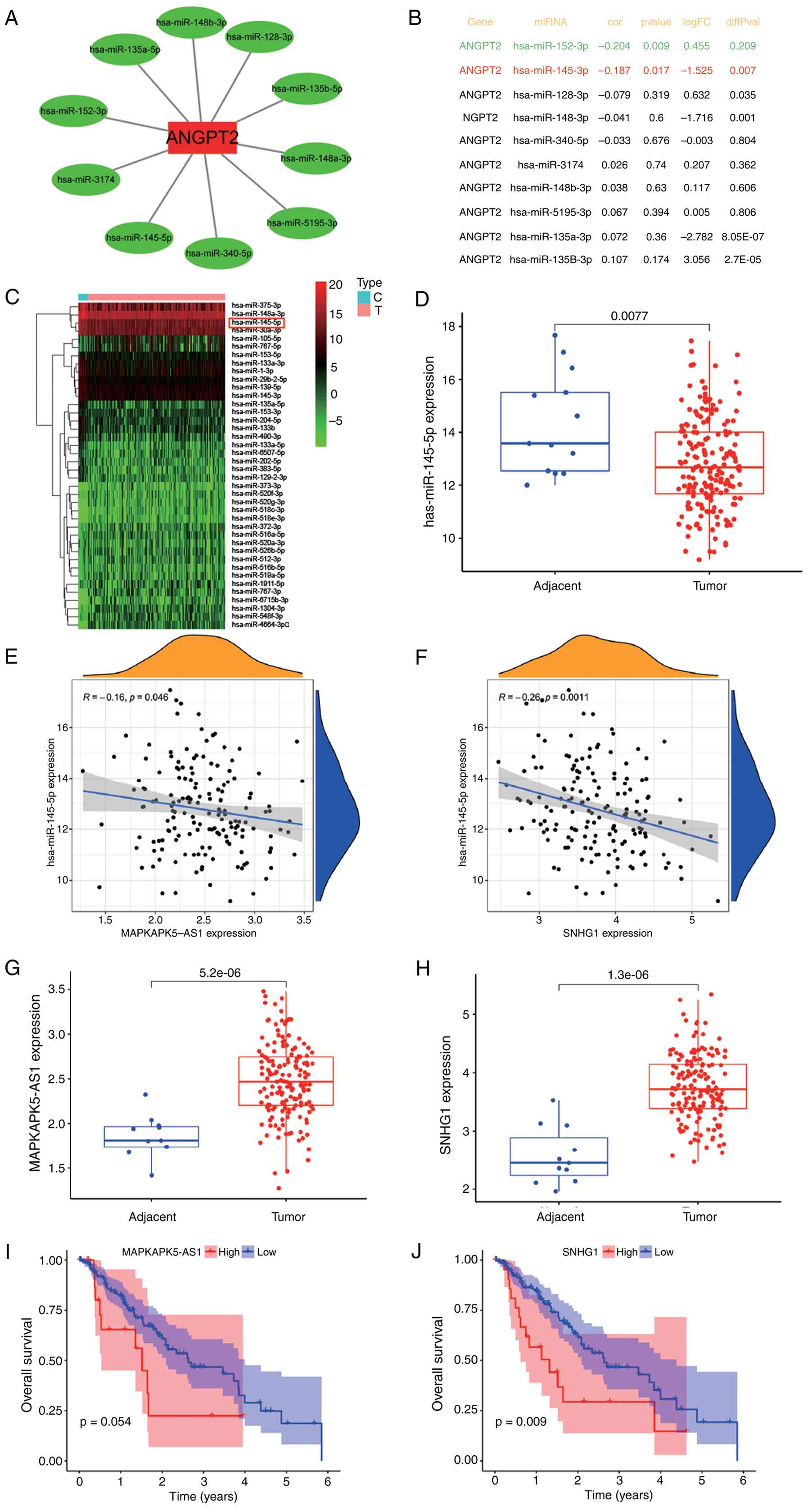 The non-coding RNAs are well-established modulators of gene expression. To identify potential upstream regulators of ANGPT2, StarBase was employed to predict miRNAs with binding potential to the ANGPT2 3′ untranslated region (3′ UTR), requiring consensus across at least two prediction algorithms. This yielded 10 candidate miRNAs, which were visualized in a regulatory network using Cytoscape (v3.9.1; http://cytoscape.org/). (Fig. 4A). Given that miRNAs exert regulatory control by suppressing their target genes (20), an inverse correlation between candidate miRNAs and ANGPT2 was hypothesized. Correlation analysis using TCGA-ESCA data revealed that only miR-152-3p and miR-145-5p exhibited significant negative correlations with ANGPT2 expression (Fig. 4B). Of these, only miR-145-5p was significantly impaired in ESCA tissues (P=0.0077; Fig. 4C and D), positioning it as the most plausible direct regulator of ANGPT2 in ESCA. StarBase was then utilized to forecast the upstream lncRNA of miR-145-5p, to identify the regulatory factors influencing its expression. According to the present results, 38 kinds of lncRNAs could bind miRNAs. miRNAs can induce gene silencing through their binding to mRNAs, while IncRNAs can regulate gene expression through their competitive binding to miRNAs. IncRNAs can bind to miRNAs through miRNA response elements, thereby impacting gene silencing caused by miRNAs. Hence, an inverse relationship is expected to exist between lncRNAs and miRNAs. Through the TCGA analysis (Fig. 4E and F), only MAPKAPK5-AS1 (P=0.046) and SNHG1 (P=0.0011) displayed a negative link with miR-145-5p. Eventually, the significance and predictive capabilities of MAPKAPK5-AS1 and SNHG1 were explored in ESCA. As demonstrated in Fig. 5G-J, MAPKAPK5-AS1 was significantly upregulated in ESCA (P=5.2×10−6), but its upregulation did not have a significant influence on patient prognosis (P=0.054). SNHG1 was also significantly upregulated in ESCA (P=1.3×10−6), and SNHG1 overexpression in ESCA suggested that patients had a poor prognosis (P=0.009). Combined with the aforementioned analysis, MAPKAPK5-AS1 and SNHG1 may negatively regulate miR-145-5p and promote ANGPT2 expression. To validate this regulatory axis (MAPKAPK5-AS1/SNHG1 → miR-145-5p → ANGPT2), dual-luciferase reporter assays were performed. WT and MUT recombinant vectors of ANGPT2 3′UTR, MAPKAPK5-AS1 and SNHG1 were constructed, with the binding region sequence mutated from ‘AACTGGA’ to ‘TTGACCT’ (Fig. S3A-C). The dual-luciferase reporter assay results demonstrated that miR-145-5p mimic significantly reduced the luciferase activity of the ANGPT2 3′UTR-WT vector, but had no obvious effect on the MUT vector; meanwhile, both MAPKAPK5-AS1-WT and SNHG1-WT vectors could significantly inhibit the inhibitory effect of miR-145-5p mimic on luciferase activity, while the MUT vectors lost this regulatory effect (Fig. S3D-F). These findings confirmed the direct binding of miR-145-5p to the 3′UTR of ANGPT2, and the specific binding of MAPKAPK5-AS1 and SNHG1 to miR-145-5p, verifying the existence of the MAPKAPK5-AS1/SNHG1/miR-145-5p/ANGPT2 ceRNA regulatory axis in ESCA.