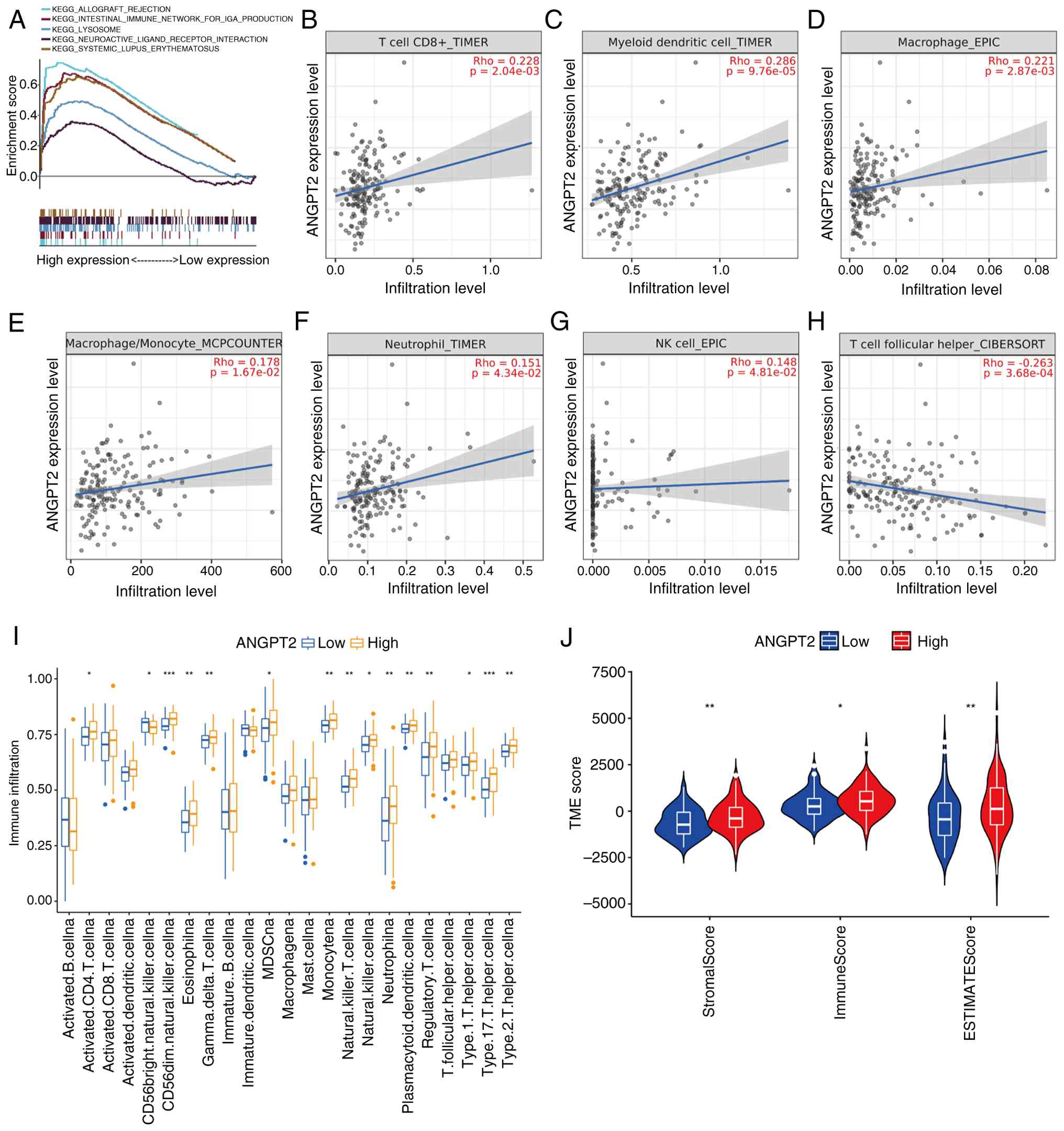 To ascertain the differentially activated signaling pathways in ESCA, a GSEA was conducted on the datasets of ANGPT2 with high and low expression. The signaling pathway with the most significant enrichment was selected based on its NES. The ANGPT2 high-expression phenotype was differentially enriched in allogeneic rejection, IGA-producing intestinal immune network, neuroactive ligand receptor interaction, lysosome and systemic lupus erythematosus (SLE) (Fig. 5A). These enrichment results suggested that ANGPT2 was related to immunity. The ICs infiltrating tumors can profoundly affect tumor progression. The correlation between ANGPT2 expression in ESCA and the analyzed ICs, such as CD8+ T cells, dendritic cells (DCs), monocytes, macrophages (MPh), neutrophils, natural killer cells (NKs) and T cell follicular helper cells, was significant (Fig. 5B-H). To quantify differences in immune infiltration across the broader immune landscape, ssGSEA was used to compare 23 distinct IC subsets between high- and low-ANGPT2 groups. Results demonstrated significant disparities in immune infiltration profiles, with high-ANGPT2 tumors exhibiting elevated infiltration across multiple IC subtypes (Fig. 5I). Further characterization of the TME using the ESTIMATE algorithm manifested that ANGPT2 overexpression correlated with significantly higher stromal, immune and ESTIMATE scores (Fig. 5J), indicating a more immune- and stroma-rich TME, consistent with enhanced immune recruitment or remodeling. To probe the mechanistic link between ANGPT2 and immune activation, correlations between ANGPT2 levels and established IC marker genes in ESCA were analyzed using TCGA data (Table IV). ANGPT2 showed strong positive correlations with markers of T cell (CD3G and CD4), T follicular helper cell (ICOS), M1-MPh (NOS2, IRF5 and PTGS2), M2-MPh (VSIG4, CD163 and MS4A4A), neutrophil cell (FCGR3B), DC (HLA-DPB1, HLA-DRA, NRP1, HLA-DPA1 and ITGAX), NKs (NKG7, FCGR3A) and monocyte cell (S100A8, S100A9, CD68 and LYZ). ANGPT2 is highly correlated with immune invasion, but its expression in ICs is very low. The results of single-cell sequencing of ESCA are depicted in Fig. S2. The aforementioned results partially support that ANGPT2 is positively correlated with immunity.