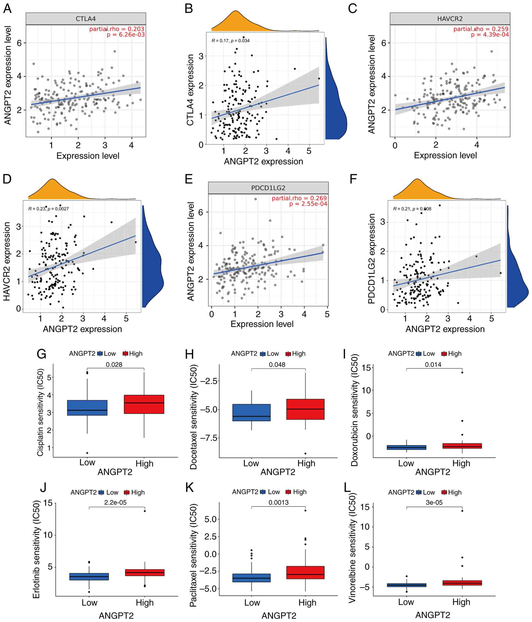 Tumor cells can modify the TME and facilitate immune system evasion by the tumor (21). The relation between 70 immune checkpoints and ANGPT2 was analyzed via the TCGA database (Table SI; Fig. 6B, D and F). Immune checkpoints, including CTLA-4 (22), HAVCR2 (23) and PDCD1LG2 (24), play a key role in cancer progression. Since ANGPT2 may play a carcinogenic role in ESCA, the relationship between ANGPT2 and CTLA-4, as well as HAVCR2 and PDCD1LG2, was also evaluated using TIMER2.0. ANGPT2 expression in ESCA was positively related to CTLA-4, HAVCR2 and PDCD1LG2 (Fig. 6A, C and D). The findings suggest that the evasion of the immune system by tumors may be involved in ESCA development through the action of ANGPT2. To explore its potential clinical relevance in therapeutic response, the sensitivity of ESCA tumors stratified by ANGPT2 expression levels to commonly used chemotherapeutic agents, was evaluated. Notably, the low ANGPT2 expression group exhibited lower IC50 values for chemotherapeutics, including cisplatin, docetaxel, doxorubicin, erlotinib, paclitaxel and vinorelbine. To summarize, the findings suggest a correlation between drug sensitivity and ANGPT2 (Fig. 6G-L).