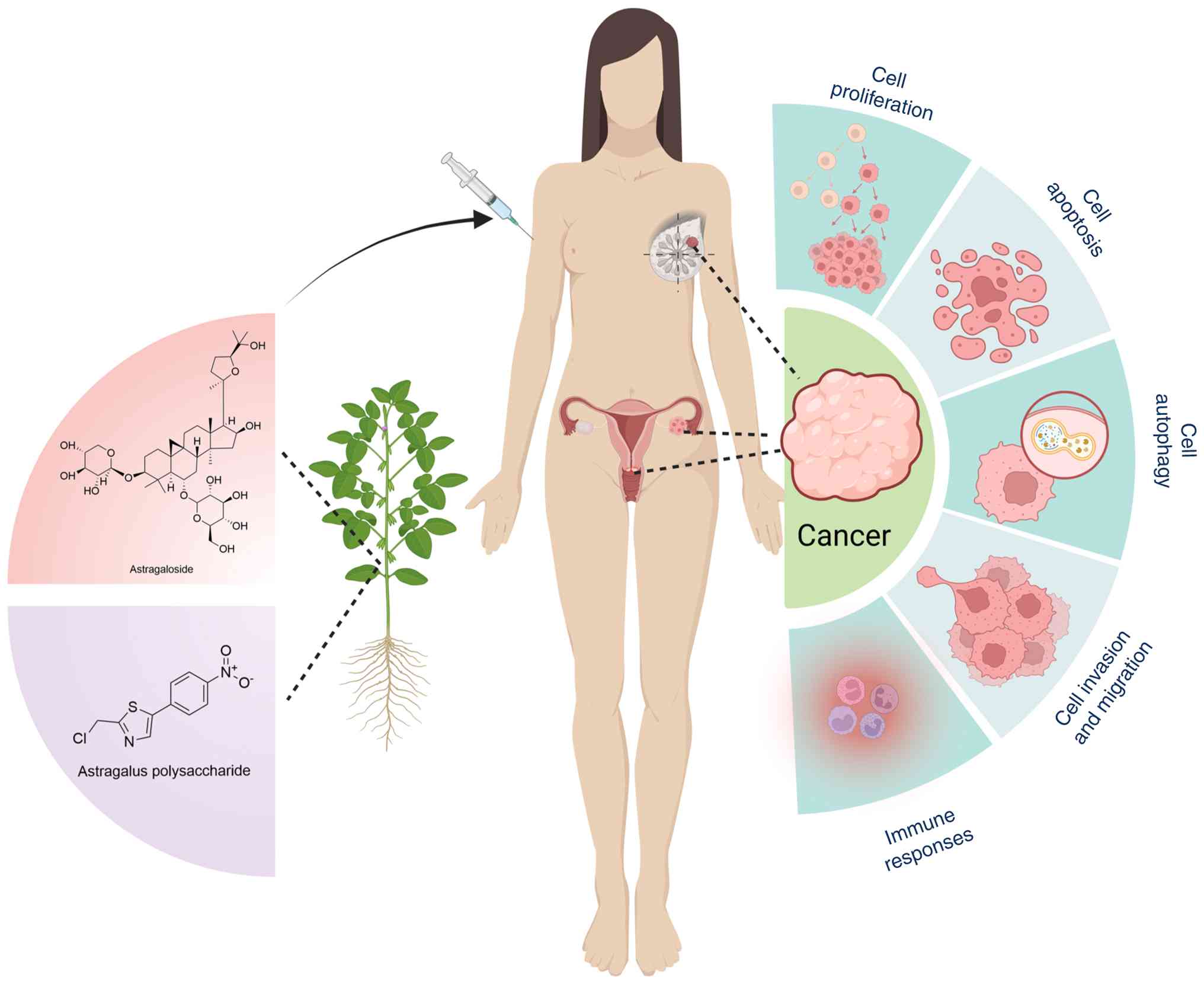 Beyond oncology, Astragalus has shown beneficial effects in anti-inflammatory, antioxidant and anti-infective settings (33–35). Accordingly, its use in patients with cancer is primarily supported by its roles in immunoregulation and functional support. In this population, Astragalus may help relieve frequent symptoms such as fatigue (36), anorexia (37) and vomiting (38), while enhancing immune competence and improving quality of life (39). Therefore, in the clinical management of female malignancies, Astragalus and its preparations are widely used as adjunctive interventions to improve treatment tolerance, support therapeutic response and potentially enhance prognosis.