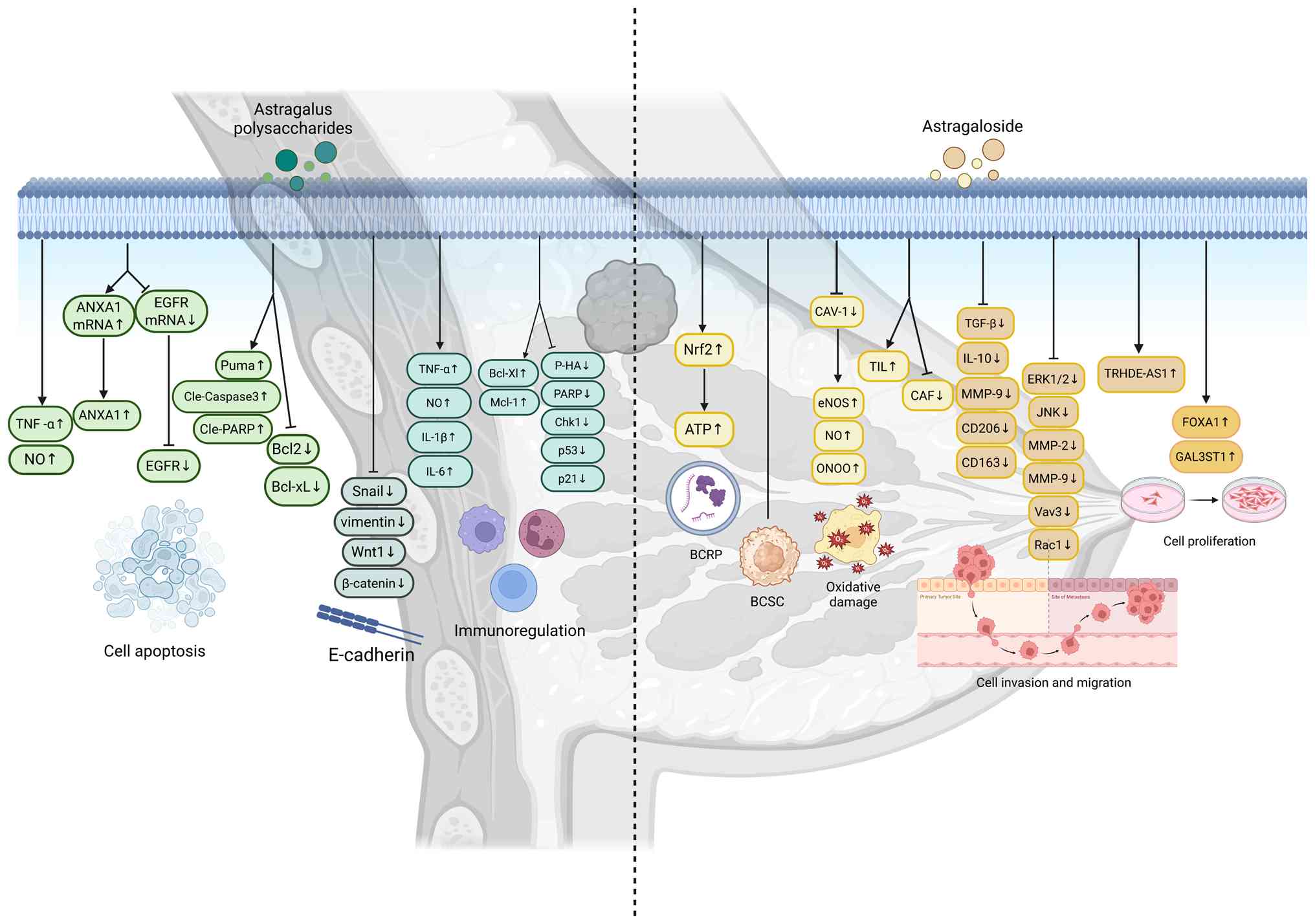 Accumulating evidence indicates that ASTs, particularly astragaloside IV (AS-IV), exert robust antitumor effects through multiple mechanisms (49). Because chemoresistance remains a major barrier to effective cancer therapy (50), a study has investigated the potential of AS-IV to restore treatment sensitivity. Lou et al (51) reported that AS-IV upregulates Nrf2 and increases intracellular ATP levels, thereby enhancing the efflux function of breast cancer resistance protein (BCRP). Huang et al (52) showed that AS-IV markedly reduces the stemness of breast cancer stem cells and reverses paclitaxel resistance in MCF7-derived cancer stem cells by modulating the (hypoxia-inducible factor) HIF-1α/HIF-2α axis and inhibiting Notch, PI3K/Akt/mTOR and JAK/STAT3 signaling. Caveolin-1, a membrane protein linked to metastasis and drug resistance (53), has also been reported to be downregulated by AS-IV in a dose-dependent manner. This change activates the endothelial nitric oxide (NO) synthase (eNOS)/NO/peroxynitrite (ONOO−) pathway, promotes oxidative damage, and increases paclitaxel sensitivity in MCF 7 and MDA MB 231 cells (54). In addition, a liposomal co-delivery system incorporating oxymatrine and AS-IV suppresses cancer-associated fibroblast activation and increases tumor-infiltrating lymphocytes, thereby potentiating the efficacy of programmed cell death protein 1 inhibitors and supporting the potential utility of AS-IV-based strategies in breast cancer immunotherapy (55).