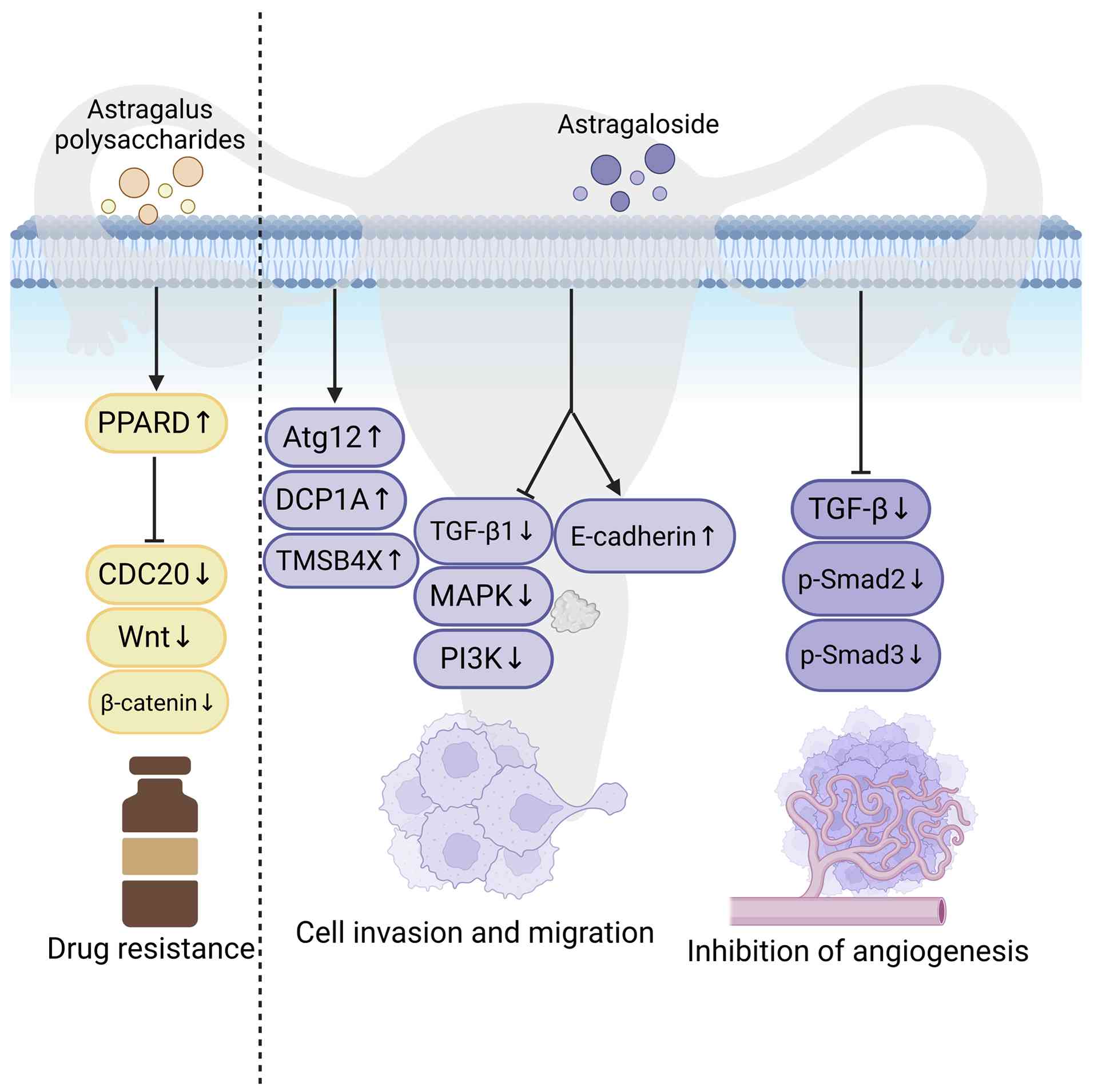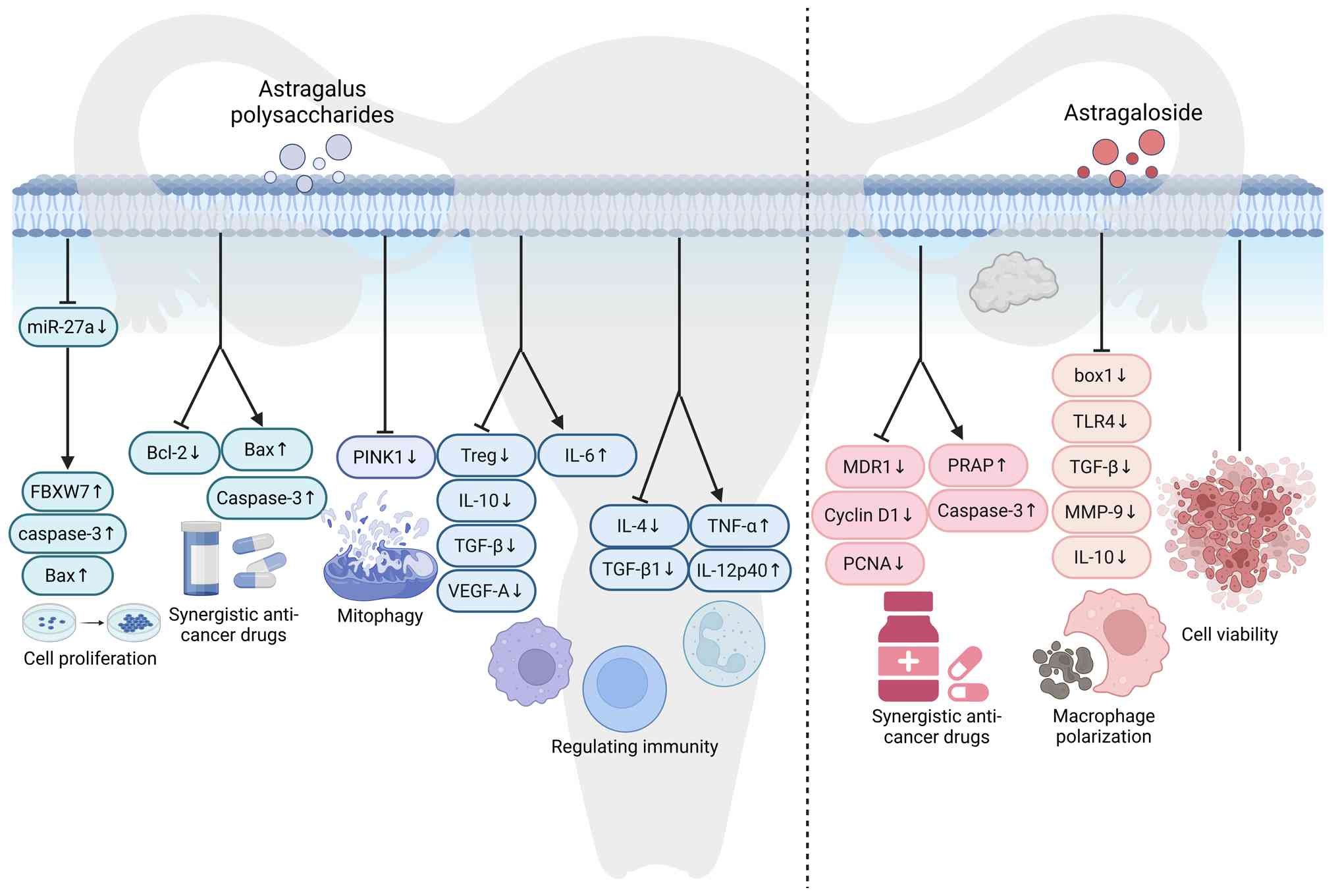 Astragalus membranaceus has traditionally been used to enhance immune function and support overall physiological homeostasis. In contemporary oncology, it is increasingly applied as an adjuvant therapy, with particular relevance to the management of common malignancies in women, such as breast, cervical and ovarian cancers (26). A pharmacological study indicates that bioactive constituents of Astragalus, such as astragaloside III, exert bidirectional immunomodulatory actions by activating immune effector cells, including lymphocytes and natural killer (NK) cells, thereby strengthening antitumor immunity. These constituents may also mitigate immunosuppressant-associated myelosuppression, which can improve therapeutic efficacy and reduce treatment-related adverse effects (27). In addition, APS has been reported to upregulate IL-12, TNF-α, Bax and Caspase-3, and downregulate Bcl-2, thereby exerting antitumor activities through immune regulation, induction of tumor cell apoptosis, and inhibition of invasion and migration (28,29).