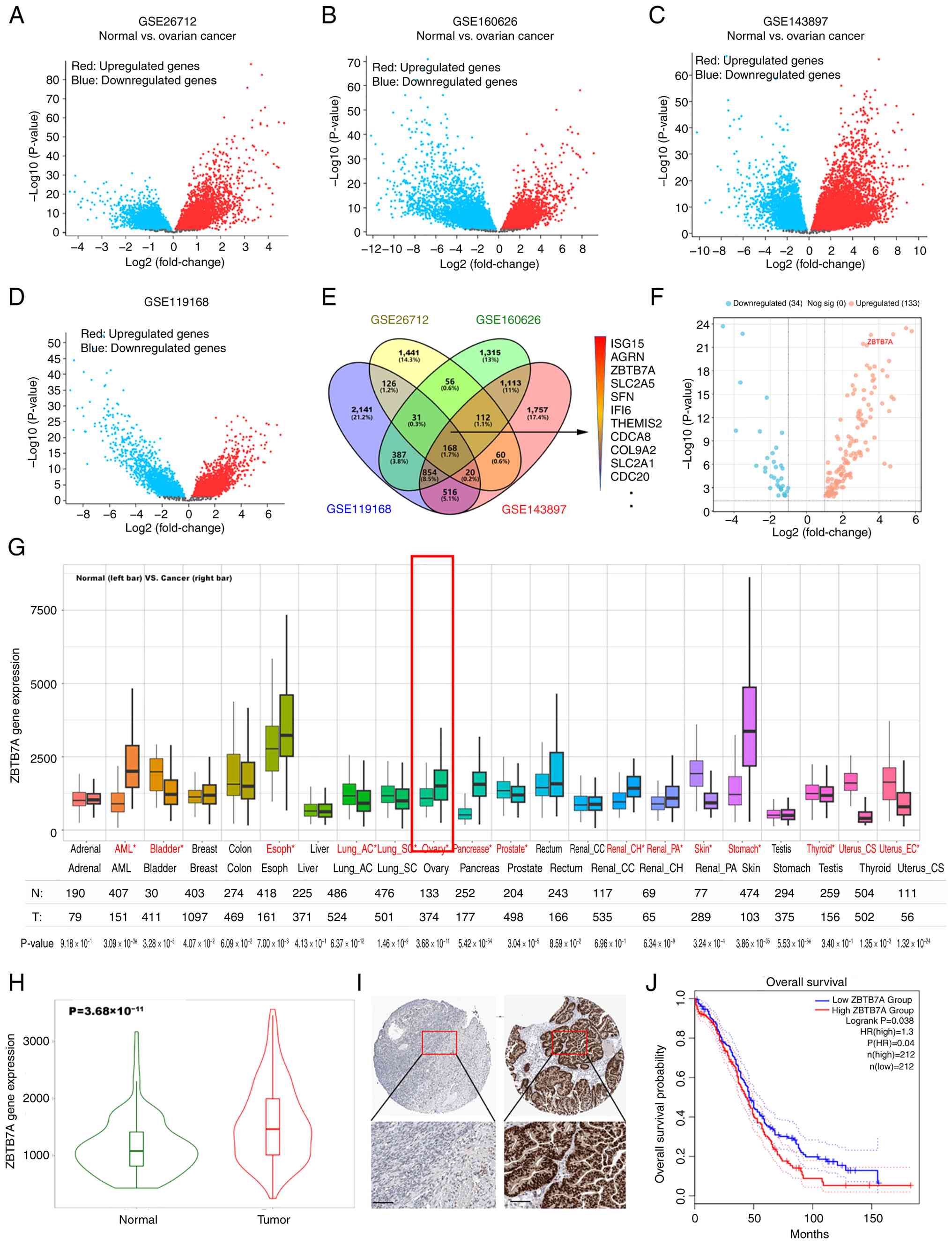 To identify DEGs in OV, four independent OV GEO datasets (GSE26712, GSE160626, GSE143897 and GSE119168) were analyzed. Each dataset revealed widespread transcriptional changes between tumor and normal tissues (Fig. 1A-D). By intersecting the results, 168 common dysregulated genes across all four cohorts were obtained. Among these, ZBTB7A appeared consistently upregulated and was highlighted in a representative volcano plot (Fig. 1F). To further evaluate the clinical relevance of ZBTB7A, its expression was examined in pan-cancer datasets. As shown in Fig. 1G, ZBTB7A was broadly elevated across multiple tumor types, with OV showing one of the most significant increases. A direct comparison of tumor and healthy ovarian samples (TNMplot) confirmed this result, showing a significant increase in ZBTB7A expression in ovarian tumor samples (Fig. 1H). Protein-level evidence was obtained from the Human Protein Atlas (HPA) dataset, where immunohistochemistry images indicated stronger nuclear staining of ZBTB7A in OV samples relative to healthy ovarian tissues (Fig. 1I). Consistently, Kaplan-Meier survival analysis revealed that higher ZBTB7A expression was significantly associated with a shorter OS (log-rank P=0.038; Fig. 1J). Overall, these results demonstrated that ZBTB7A was significantly upregulated in OV and could serve as a marker of poor prognosis. Univariate and multivariate Cox regression analyses using TCGA-OV cohort further identified ZBTB7A expression as an independent prognostic factor for OS after adjustment for age and tumor grade (Table I).