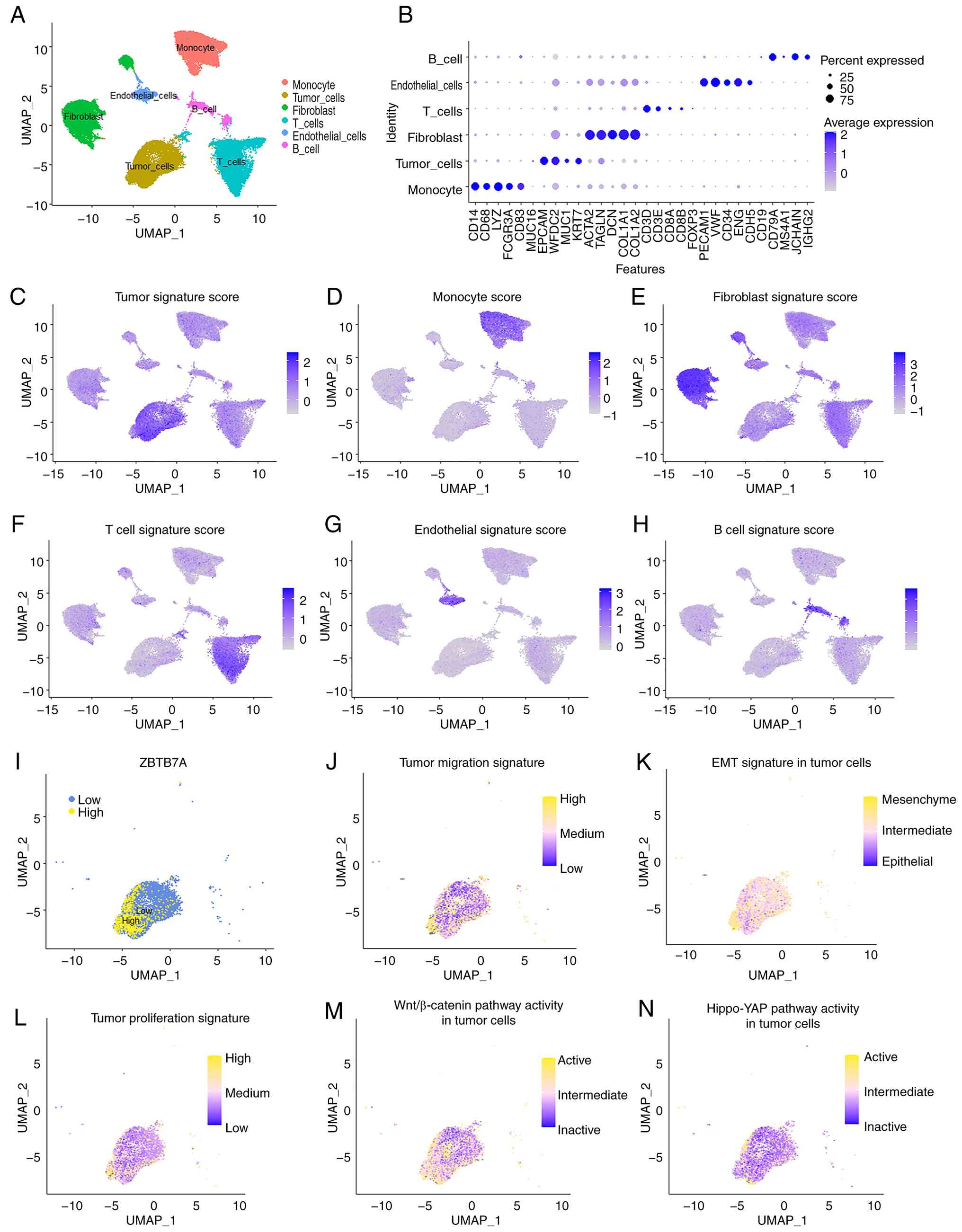 To further characterize the cellular distribution and functional associations of ZBTB7A in OV, a single-cell RNA-seq dataset of ovarian tumors was analyzed. UMAP clustering identified the major cell populations, including malignant epithelial cells, fibroblasts, endothelial cells, monocytes, T cells and B cells, each defined by canonical marker expression (Fig. 2A and B). Module scoring confirmed that the annotated clusters captured expected lineage-specific signatures (Fig. 2C-H). Next, downstream analyses were restricted to the malignant epithelial (tumor) compartment, and tumor cells were stratified into ZBTB7A-high and ZBTB7A-low groups (Fig. 2I). Notably, tumor cells exhibiting high ZBTB7A expression displayed markedly increased scores for migration, EMT and proliferation compared with ZBTB7A-low counterparts (Fig. 2J-L). Pathway enrichment at the single-cell level further supported these associations. ZBTB7A-high tumor cells showed higher activities of the Wnt/β-catenin and Hippo-YAP signaling pathways, both of which are well known to drive OV progression (Fig. 2M and N). Together, these analyses demonstrate that within the tumor cell compartment, high ZBTB7A may mark an aggressive transcriptional state characterized by enhanced motility, EMT, proliferative drive and activation of malignancy-associated pathways.