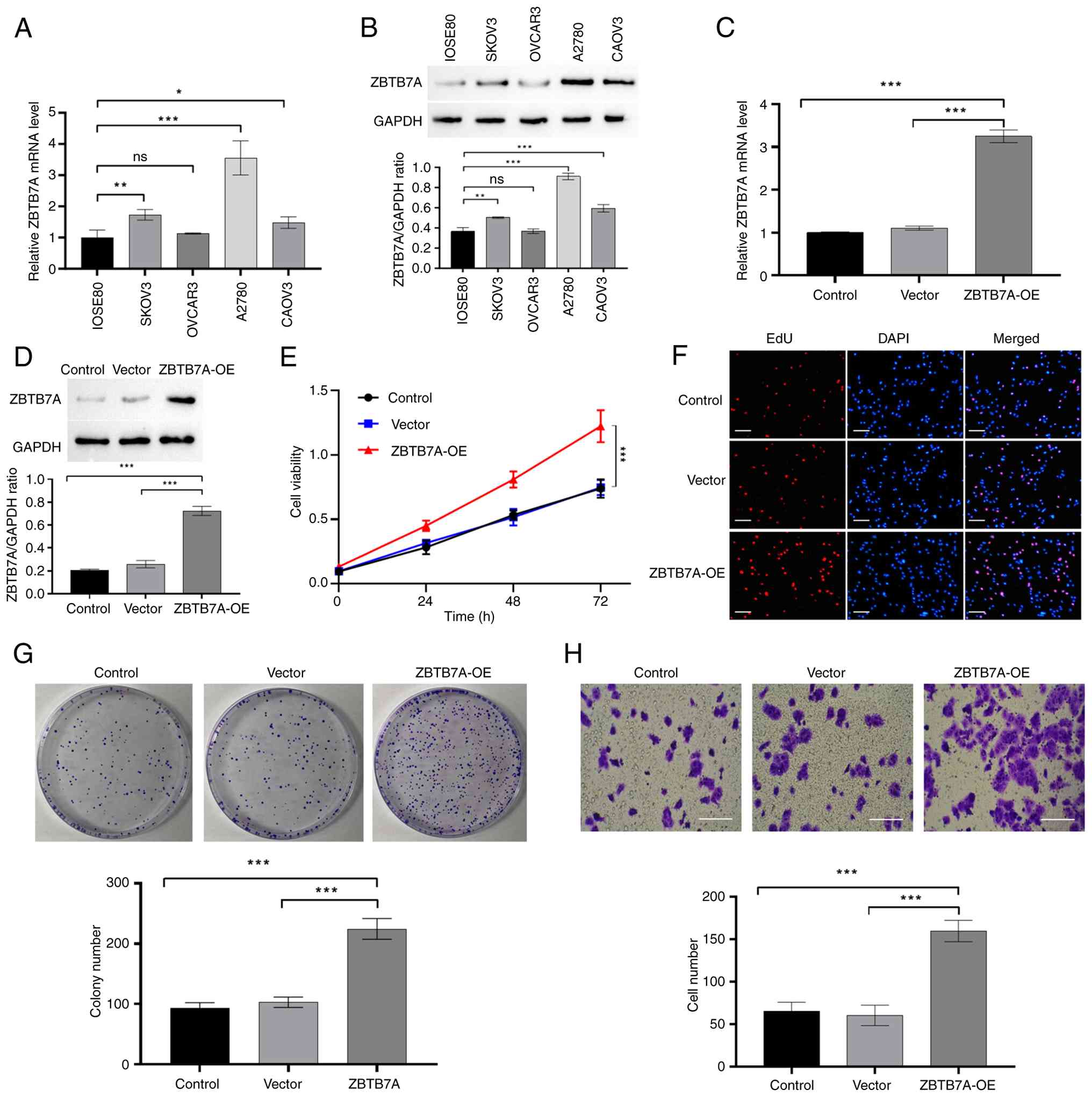 Functionally, overexpression of ZBTB7A in OVCAR3 cells markedly promoted malignant phenotypes. In the CCK-8 assay, ZBTB7A-OE cells displayed a clear, time-dependent increase in viability compared with that in the vector control group (Fig. 3E). The EdU incorporation assay further confirmed this proliferative advantage, as ZBTB7A-OE cells exhibited a higher proportion of EdU-positive nuclei, reflecting enhanced DNA synthesis and cell-cycle progression (Fig. 3F). To extend these findings, a colony formation assay was performed, which demonstrated that ZBTB7A significantly increased clonogenic potential, with overexpressing cells forming a greater number of larger colonies compared with that in the control group. In addition, the Transwell assay showed a significant increase in the number of migrating cells in the ZBTB7A-OE group, indicating that ZBTB7A may promote a more migratory phenotype (Fig. 3H). Taken together, these gain-of-function experiments indicated that ZBTB7A-OE could enhance cell viability, proliferation, clonogenic survival and motility, supporting a pro-oncogenic role for ZBTB7A in OV.