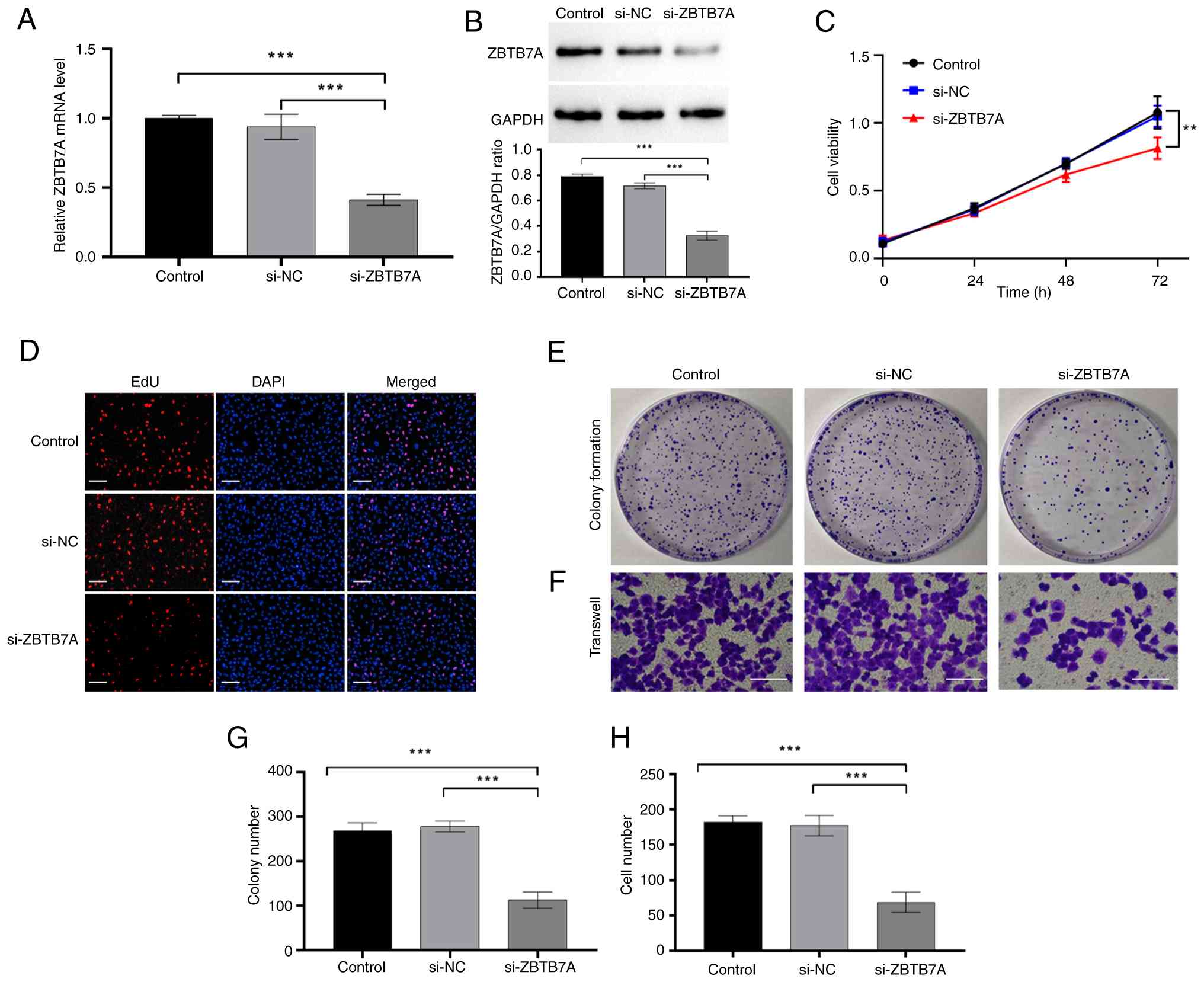 To complement the overexpression studies, the present study investigated the effects of ZBTB7A loss-of-function. Basal expression profiling indicated that A2780 cells expressed relatively high levels of ZBTB7A, and were therefore selected for knockdown experiments. Transfection with si-ZBTB7A effectively reduced both the mRNA and protein levels of ZBTB7A, as confirmed by RT-qPCR and western blotting (Fig. 4A and B).