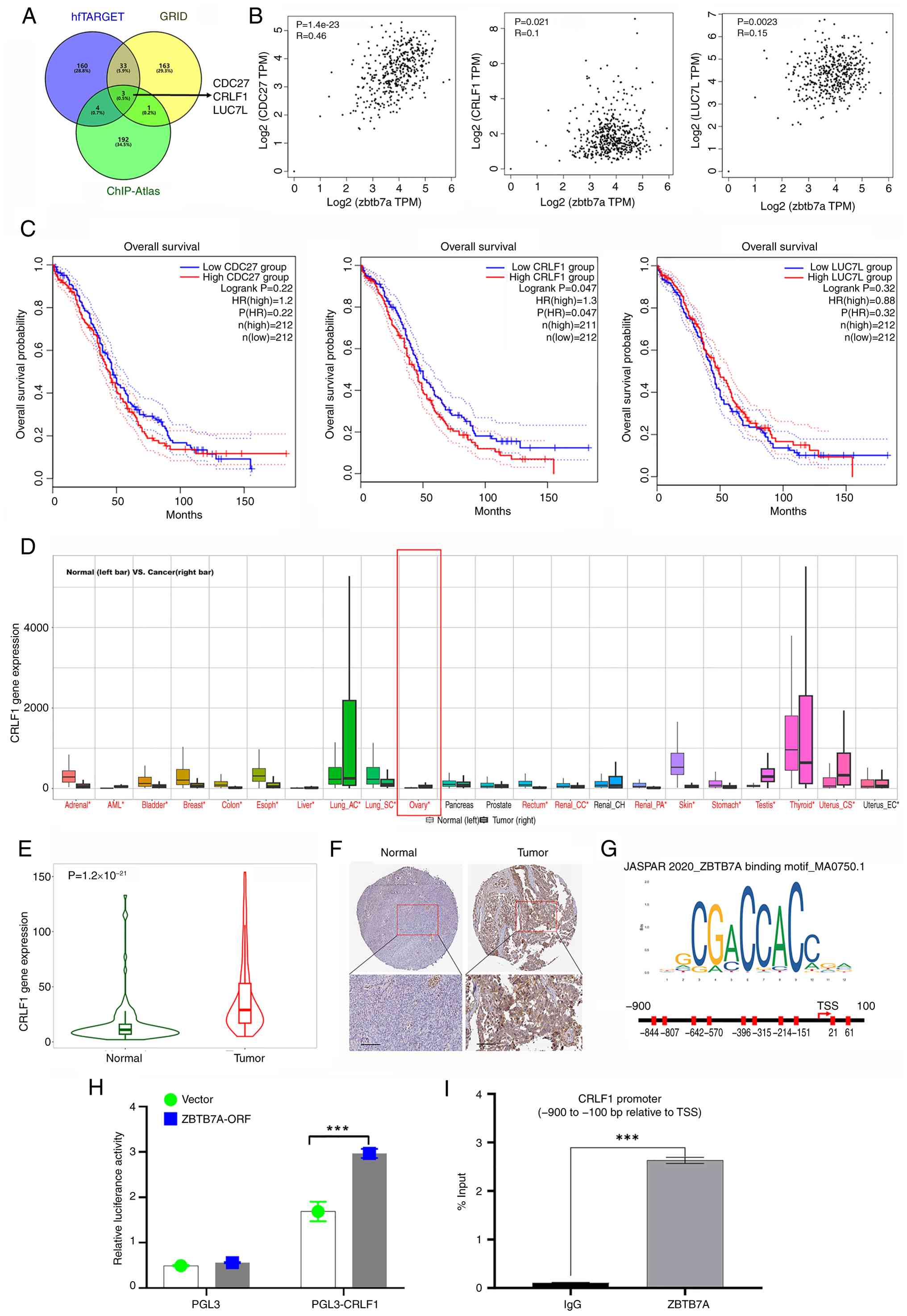 Given that ZBTB7A is a classical TF, the present study aimed to predict its potential downstream targets. To identify these targets, the findings of three complementary TF-target prediction platforms were combined: hfTarget, GRID and ChIP-Atlas. Cross-database intersection analysis revealed three overlapping candidate genes: CDC27, CRLF1 and LUC7L, which were consistently predicted to be regulated by ZBTB7A. Subsequently, the correlation between these candidates and ZBTB7A was analyzed in TCGA-OV cohort. The results revealed that CDC27 expression exhibited a moderate positive correlation with ZBTB7A, whereas CRLF1 and LUC7L showed weak but significant correlations with ZBTB7A, suggesting that they may indeed be co-regulated (Fig. 5B). The prognostic value of these candidates was then assessed. Kaplan-Meier analysis revealed that higher expression of CRLF1, but not CDC27 or LUC7L, was significantly associated with a poorer OS in patients with OV (Fig. 5C). Notably, survival analysis revealed that only CRLF1 mirrored the clinical outcome pattern of ZBTB7A. Based on this concordance between expression, correlation and prognostic outcome, CRLF1 was selected as the most relevant downstream candidate for further analysis. Next, CRLF1 expression was also analyzed in pan-cancer datasets. As shown in Fig. 5D, CRLF1 was elevated in several tumor types, with OV displaying one of the most significant increases. Consistent with this, direct comparison between ovarian tumor and healthy samples confirmed significantly increased CRLF1 expression (Fig. 5E).