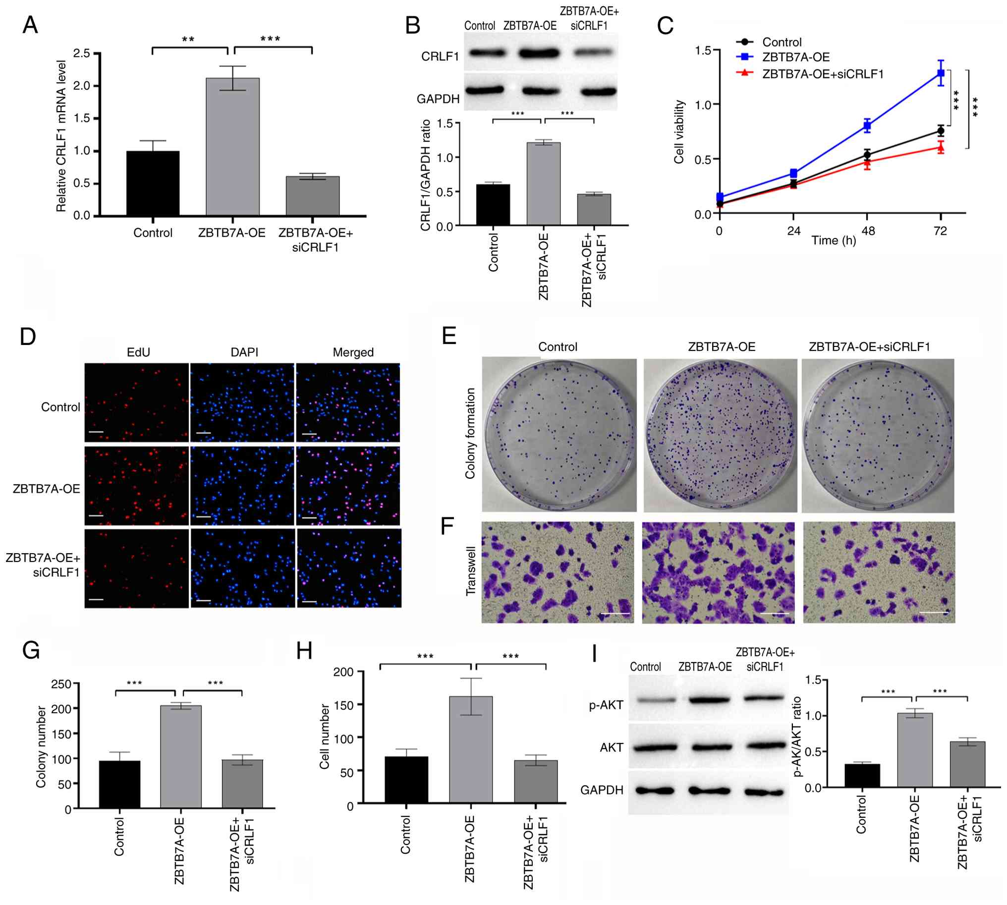 To assess whether CRLF1 acts downstream of ZBTB7A, its expression was examined following ZBTB7A-OE in OVCAR3 cells. Both RT-qPCR and western blotting confirmed that ZBTB7A-OE led to a significant increase in CRLF1 mRNA and protein levels (Fig 6A and B). Conversely, targeted knockdown of CRLF1 using a siRNA efficiently reduced its expression (Fig. S1), as verified by RT-qPCR and western blotting. Functional assays showed that knockdown of CRLF1 significantly attenuated the oncogenic phenotypes induced by ZBTB7A. Specifically, cells were co-transfected with the ZBTB7A-OE plasmid and siCRLF1, and the CCK-8 assay demonstrated that CRLF1 knockdown attenuated the enhanced cell viability induced by ZBTB7A-OE (Fig. 6C). Furthermore, the EdU assay confirmed that siCRLF1 blocked the ZBTB7A-OE-induced increase in DNA synthesis and proliferative activity (Fig. 6D). The colony formation assay further revealed that CRLF1 knockdown diminished both the number and size of colonies induced by ZBTB7A-OE (Fig. 6E). Finally, a Transwell migration assay showed that siCRLF1 markedly suppressed the pro-migratory effect of ZBTB7A-OE on OVCAR3 cells (Fig. 6F). Semi-quantitative analyses consistently demonstrated that CRLF1 knockdown largely reversed the proliferation and migration mediated by ZBTB7A (Fig. 6G and H). To further elucidate the downstream signaling mechanism, the activation status of the PI3K/AKT pathway was examined. Western blot analysis showed that ZBTB7A-OE significantly increased the levels of phosphorylated AKT, whereas CRLF1 knockdown markedly attenuated AKT phosphorylation without affecting total AKT expression (Fig. 6I). These findings indicated that CRLF1 may be required for ZBTB7A-induced activation of AKT signaling. Collectively, these results identified CRLF1 as a functional downstream effector of ZBTB7A and highlighted that the oncogenic properties of ZBTB7A in OV are mediated, at least in part, through its regulation of CRLF1.