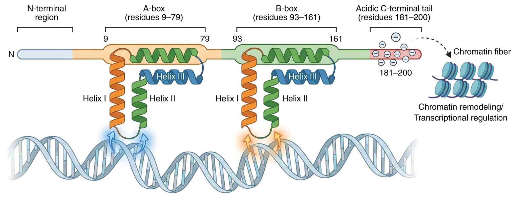 High mobility group (HMG) proteins, isolated initially from bovine thymus in 1973, are named according to their high electrophoretic mobility in polyacrylamide gels (1). The HMG family constitutes the second most abundant family of chromatin-associated proteins in the cell nucleus after histones. Based on structural characteristics, it consists of three major subfamilies: HMGA, HMGB and HMGN. HMGB1, HMGB2, HMGB3 and HMGB4 are the four major members of the HMGB subfamily. The former three members share high structural homology, each containing two tandem HMG-box domains (A- and B-box) and an acidic C-terminal tail, as illustrated in Fig. 1. These proteins can bind and bend DNA, in turn being involved in diverse cellular processes such as DNA repair, replication, recombination and transcription (2–4).