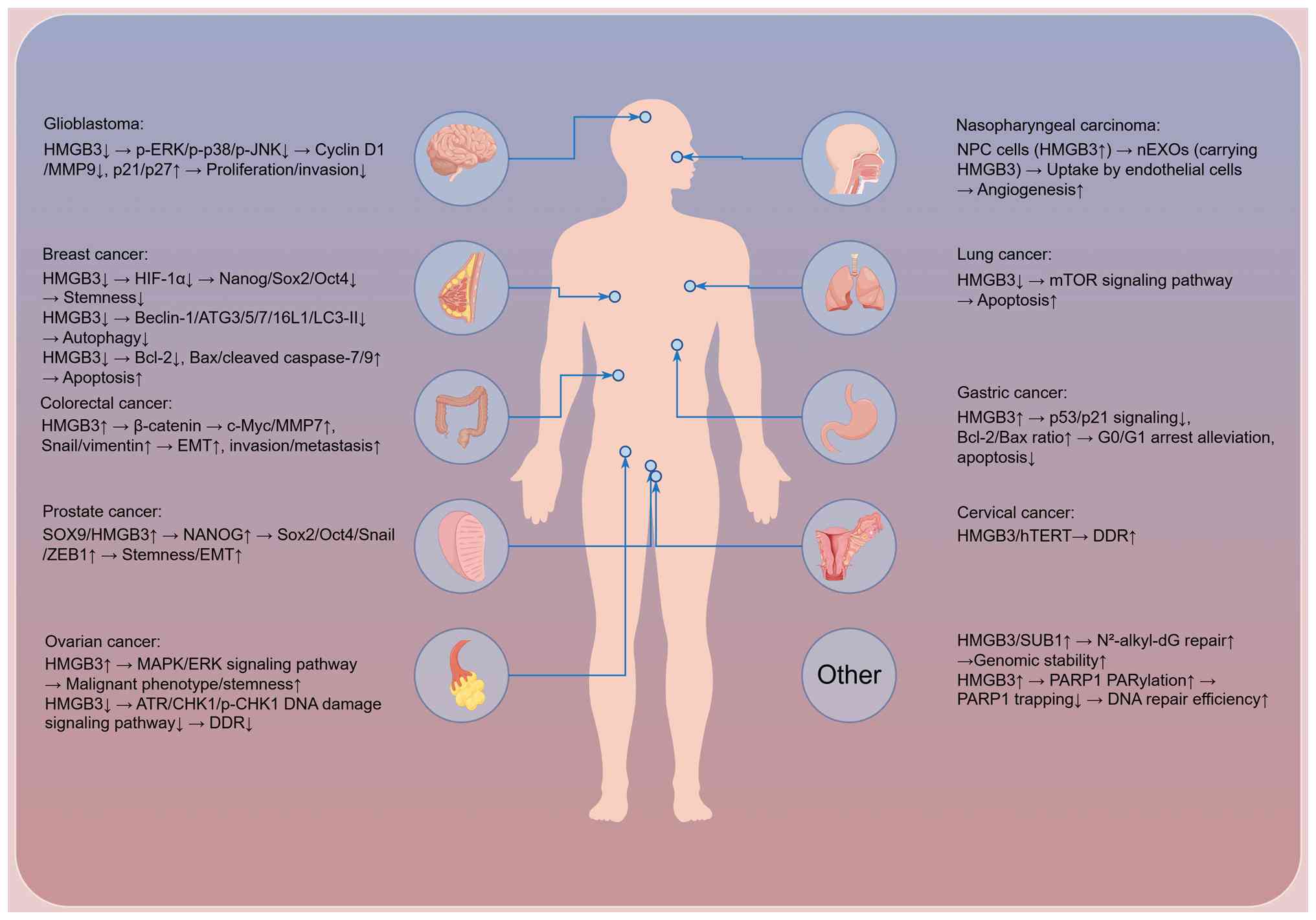 By integrating these signaling cascades, HMGB3 can coordinate malignant cell plasticity, stromal reprogramming and microenvironmental adaptation, thereby reshaping the organization and function of TME.
