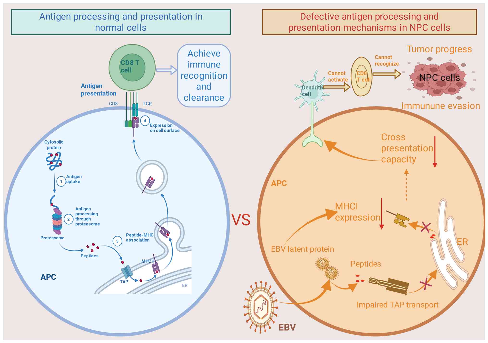 In summary, the mechanisms of defective antigen processing and presentation in NPC include TAP dysfunction, EBV protein-induced suppression of antigen presentation and impaired cross-presentation (Fig. 1). These mechanisms synergistically enable NPC cells to effectively escape immune surveillance, thereby facilitating tumor progression. Understanding these defects provides key insights into the immunoevasive strategies of NPC and may inform the development of novel immunotherapeutic approaches targeting these pathways.