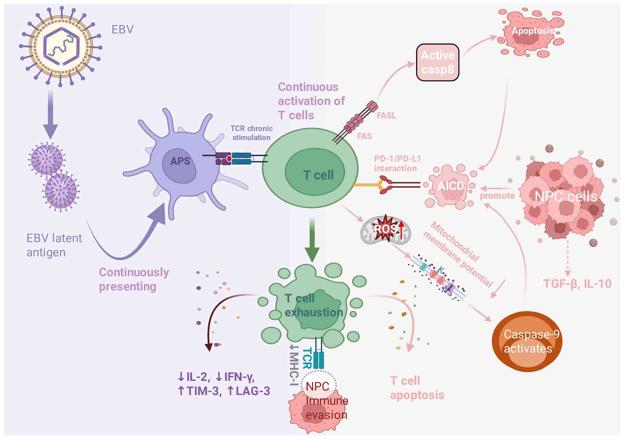 In summary, defective antigen presentation has clinical implications for NPC. Understanding the underlying mechanisms not only facilitates improved diagnosis and staging but also supports the development of immunotherapeutic strategies that restore antigen presentation and strengthen antitumor immunity. Importantly, persistent EBV antigen presentation represents more than an initiating immune event. In the context of incomplete viral clearance, continuous presentation of EBV-derived antigens sustains prolonged T cell receptor engagement and chronic immune activation. This persistent activation pressure establishes the immunological conditions under which downstream metabolic stress and functional exhaustion of T cells are likely to emerge. However, it should be noted that the majority of these findings are derived from in vitro systems or EBV-transformed cell lines, which may not fully recapitulate the complex TIME of NPC in vivo (41,42).