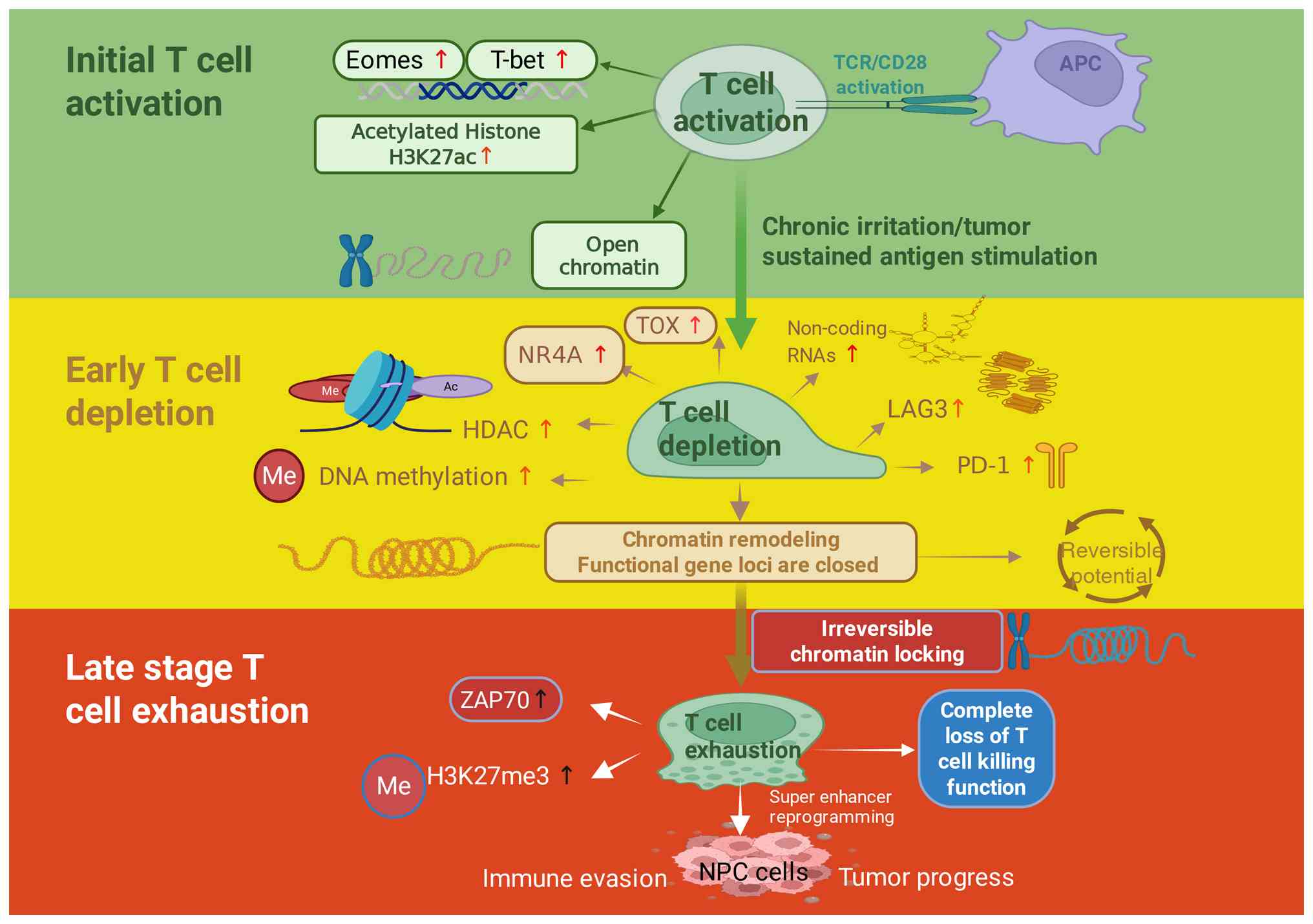 In summary, epigenetic regulation plays a pivotal role in the development and maintenance of T cell exhaustion (Fig. 3). Understanding the mechanisms involved may provide insight into potential therapeutic targets for reactivating exhausted T cells and enhancing immunotherapeutic outcomes.