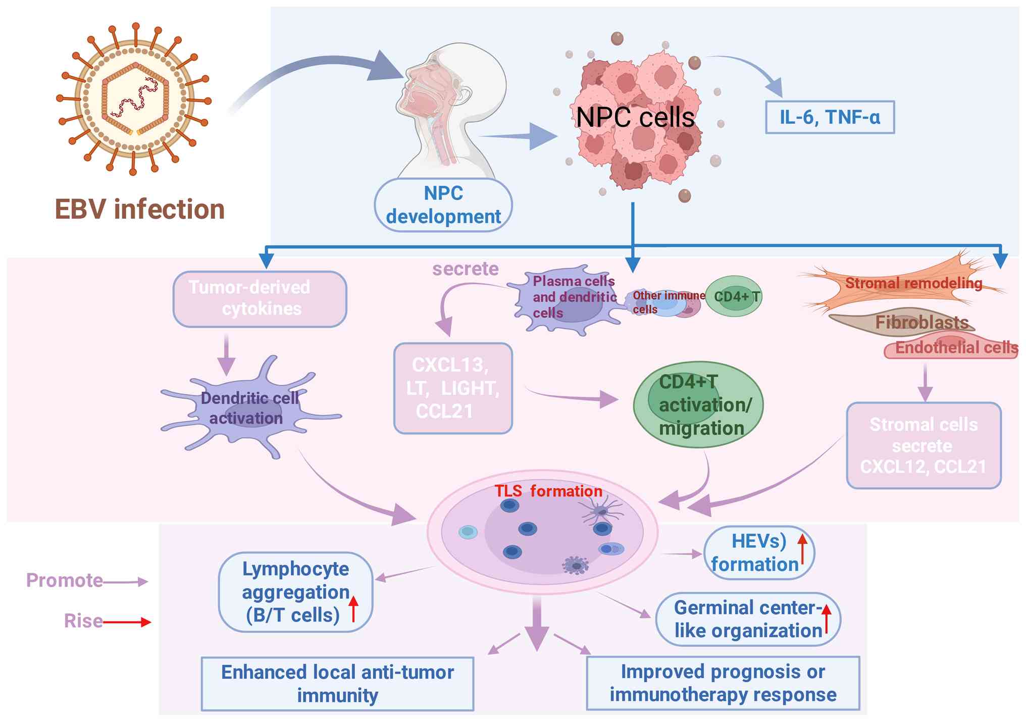 Importantly, accumulating evidence suggests that TLSs may exert a context-dependent, dual role in NPC. Mature TLSs characterized by organized B cell follicles, follicular DCs and germinal center-like structures are generally associated with effective antitumor immunity. By contrast, immature or dysregulated TLSs may harbor increased regulatory T (Treg) cells, exhausted T cells or immunosuppressive cytokine signals, potentially contributing to immune tolerance rather than immune activation. In NPC, where chronic EBV-driven inflammation persists, TLSs may dynamically shift between immune-supportive and immune-suppressive states, underscoring the need to evaluate TLS quality, maturation status and cellular composition rather than density alone (90,91).