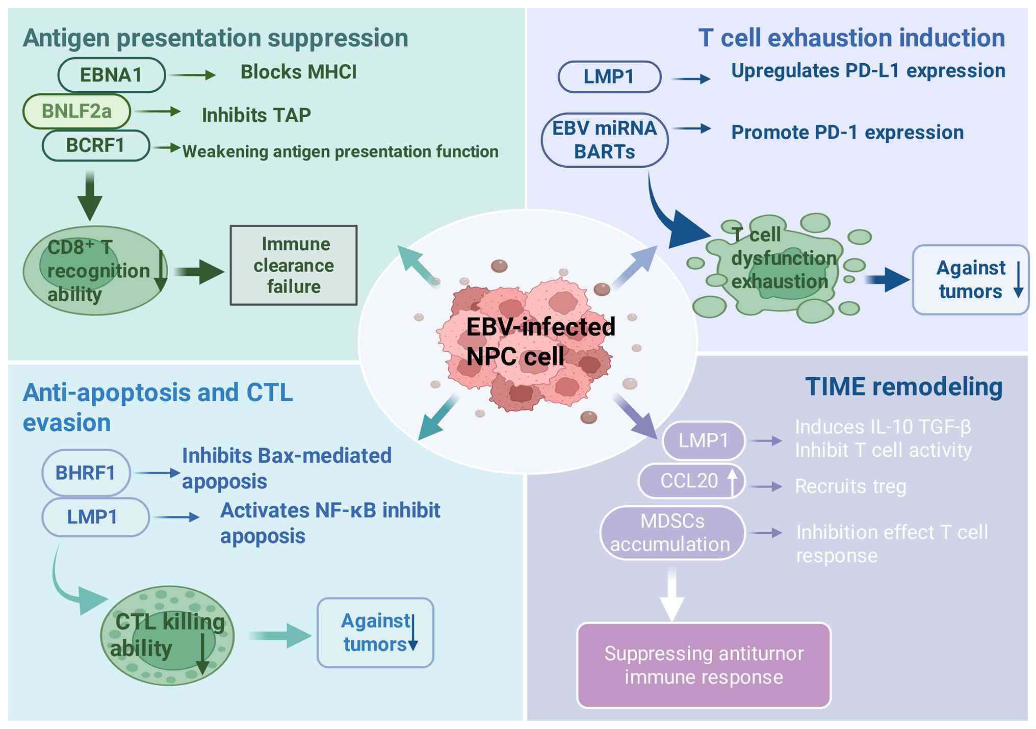 Additionally, EBV-encoded microRNAs (miRNAs) are key modulators of host antigen presentation pathways. These viral miRNAs can suppress host antiviral responses by targeting specific host genes. For example, EBV-miR-BART17-3p has been shown to impair host immunity by targeting DDX3X, thereby promoting EBV persistence and progression (21). The expression of EBV miRNAs is associated with the development of EBV-related malignancies, highlighting their functional importance in shaping the TIME.