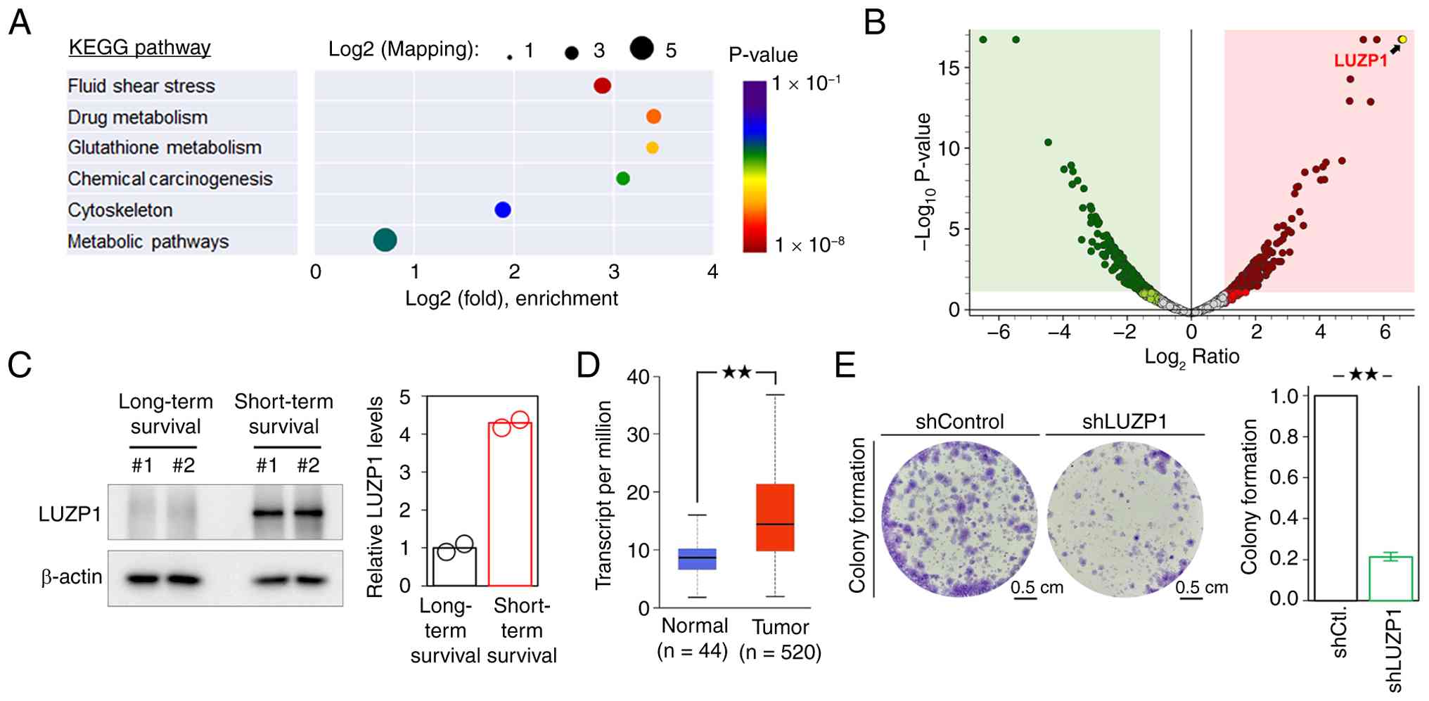 To identify protein signatures potentially associated with poor prognosis, a comparative proteomic analysis of tumor tissues from patients with HNSCC was performed with long- and short-term survival. Patients with an overall survival of <3 years were classified as the short-term survival group, whereas those with an overall survival of ≥5 years were defined as the long-term survival group. Among the 4,246 proteins identified, 187 exhibited a ≥4-fold increase in abundance in short-term survival compared with long-term survival tissues (Table SIV). KEGG pathway enrichment analysis revealed that these upregulated proteins were primarily associated with pathways related to fluid shear stress, drug metabolism, glutathione metabolism and chemical carcinogenesis (Fig. 1A). Fluid shear stress is associated with the metastatic dissemination of tumor cells within the circulatory system (21), whereas drug metabolism is associated with increased therapeutic resistance (22). These findings suggest that tumor metastasis and treatment resistance may represent key determinants underlying poor prognosis and short-term survival in patients with HNSCC. Differential protein expression between short- and long-term survival tissues was visualized using a proteomic volcano plot (Fig. 1B), where the x-axis represents the log2 fold change in protein abundance and the y-axis represents the -log10 p-value, indicating statistical significance. LUZP1 emerged as one of the most upregulated proteins in tumor tissues of patients with HNSCC with short-term survival (Fig. 1B; Table SIV). The elevated expression of LUZP1 was further confirmed in additional tumor specimens by western blot analysis (Fig. 1C). The LUZP1 mRNA expression level of HNSCC tissues was significantly higher when compared with that in the normal tissues via the UALCAN database (Fig. 1D), which provides an in-depth analysis of gene expression data from TCGA (17). Additionally, LUZP1 gene knockdown by shRNA significantly impaired the colony formation of OECM-1 cells (Fig. 1E), suggesting that LUZP1 could enhance the capacity for unlimited proliferation of HNSCC cells (23).