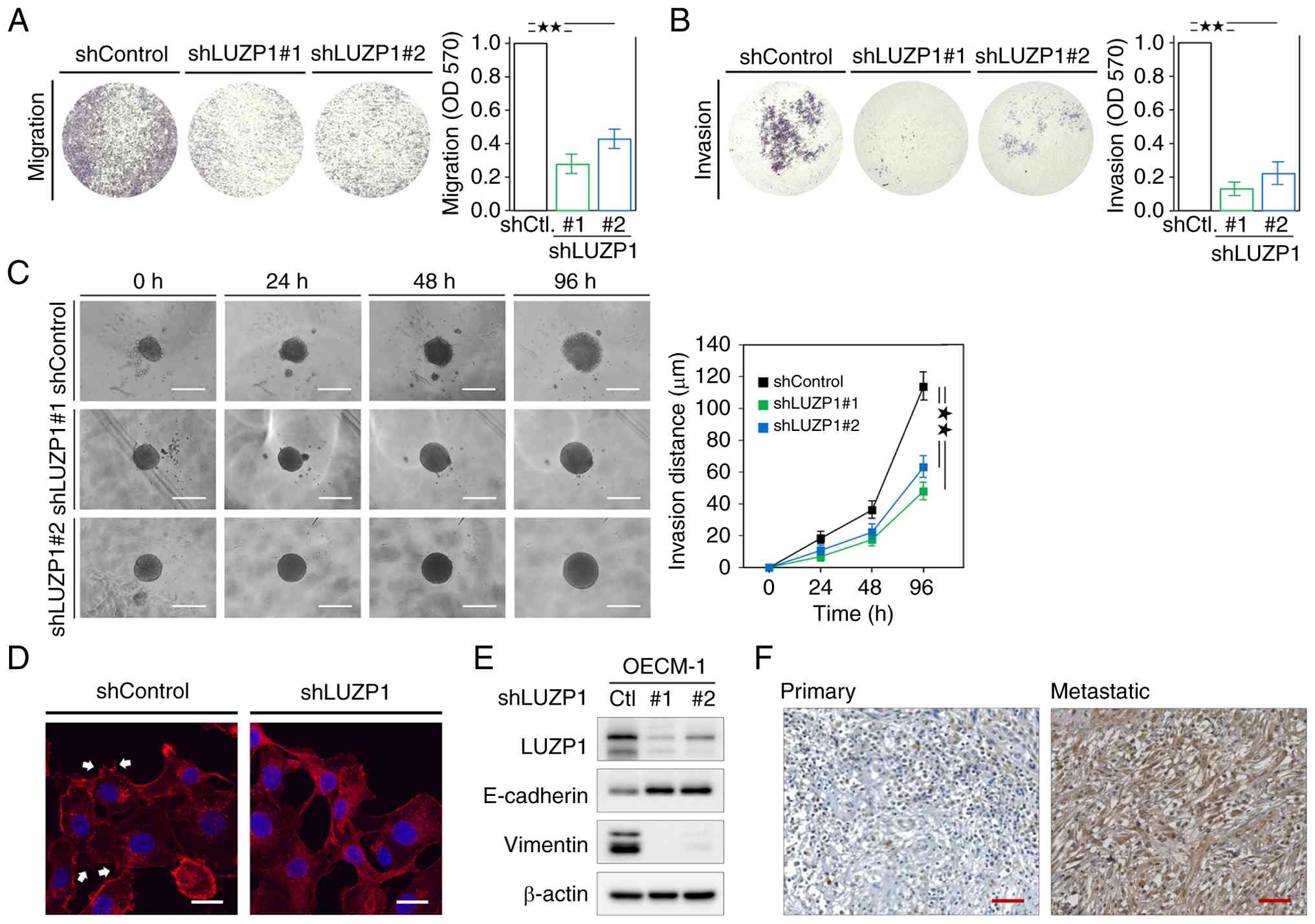 Accumulating evidence indicates that LUZP1 exerts context-dependent functions in cancer, yet its effects consistently converge on the regulation of cytoskeletal dynamics, cell migration and EMT-associated phenotypes (9,10). In glioma, deletions or loss of LUZP1 function have been associated with enhanced migration and invasion, likely through disruption of actin organization, cell division and polarity control, underscoring its role in maintaining cytoskeletal integrity (34). By contrast, a study in triple-negative breast cancer demonstrate that LUZP1 can heterodimerize with DAPK3, protecting it from proteasomal degradation and thereby indirectly promote EMT, desmosome suppression and invasive behavior (13). Similarly, in osteosarcoma, LUZP1 acts as a downstream effector of circFIRRE-miRNA regulatory circuits, facilitating tumor progression, angiogenesis and metastatic dissemination (12). Consistent with these reports, the functional analyses of the present study show that LUZP1 knockdown markedly suppresses migration and invasion of HNSCC cells, reduces invadopodia-like protrusive structures and prevents EMT-associated marker expression, as evidenced by E-cadherin upregulation and vimentin downregulation. Moreover, the observation that LUZP1 expression is elevated in metastatic lesions compared with matched primary tumors further supports its involvement in metastatic dissemination. Collectively, these findings suggest that although LUZP1 is not a canonical EMT transcription factor, it may function as an EMT-enabling factor by modulating actin cytoskeleton organization, actomyosin contractility and cellular plasticity.