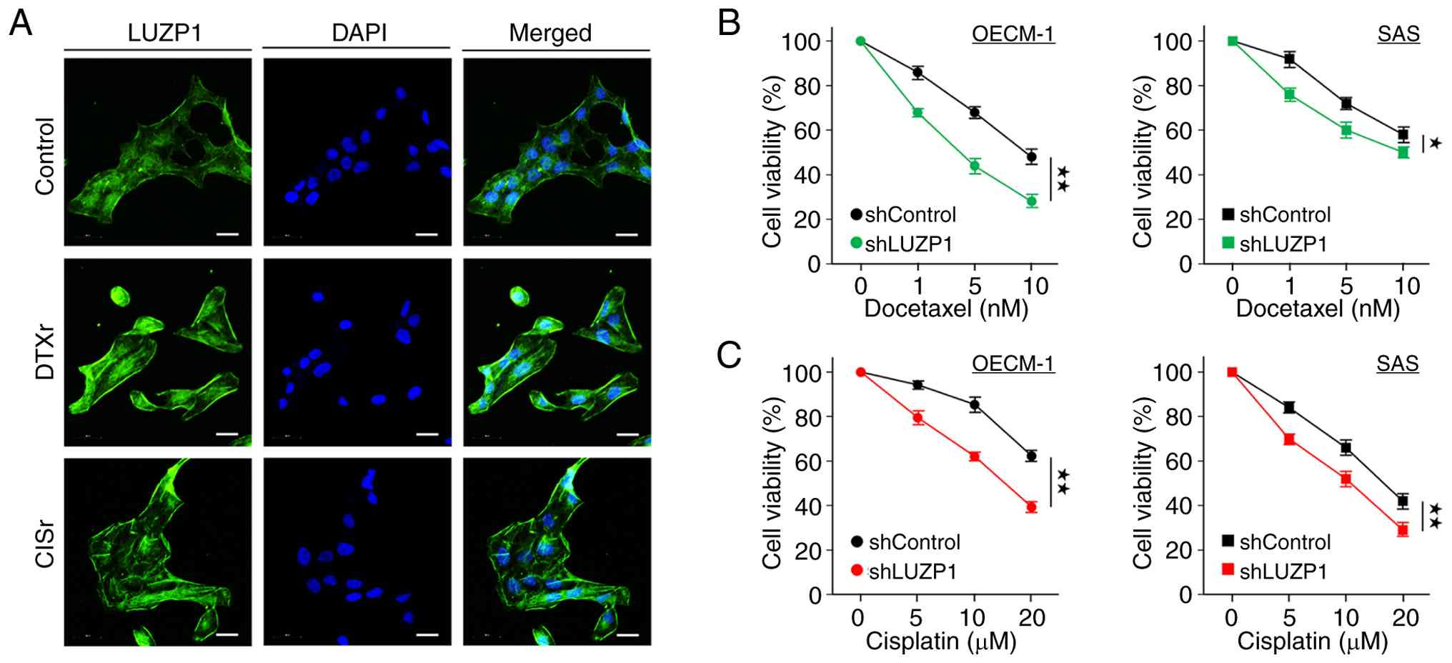 KEGG pathway analysis of upregulated proteins identified in tumor tissues from short-term survival patients with HNSCC revealed significant enrichment of pathways associated with increased therapeutic resistance (Fig. 1A). This prompted the investigation of whether elevated LUZP1 expression contributes to enhanced chemoresistance in HNSCC. To this end, DTXr and CISr OECM-1 cell lines were established by continuous exposure to DTX or CIS, two chemotherapeutic agents commonly used in HNSCC treatment (25). Immunofluorescence analysis demonstrated that LUZP1 expression was markedly elevated in both OECM-1/DTXr and OECM-1/CISr cells compared with their parental counterparts (Fig. 3A). Furthermore, MTT assays revealed that LUZP1 knockdown increased the sensitivity of OECM-1 and SAS cells to DTX and CIS (Fig. 3B and C), indicating that LUZP1 may play a functional role in mediating chemoresistance in HNSCC.