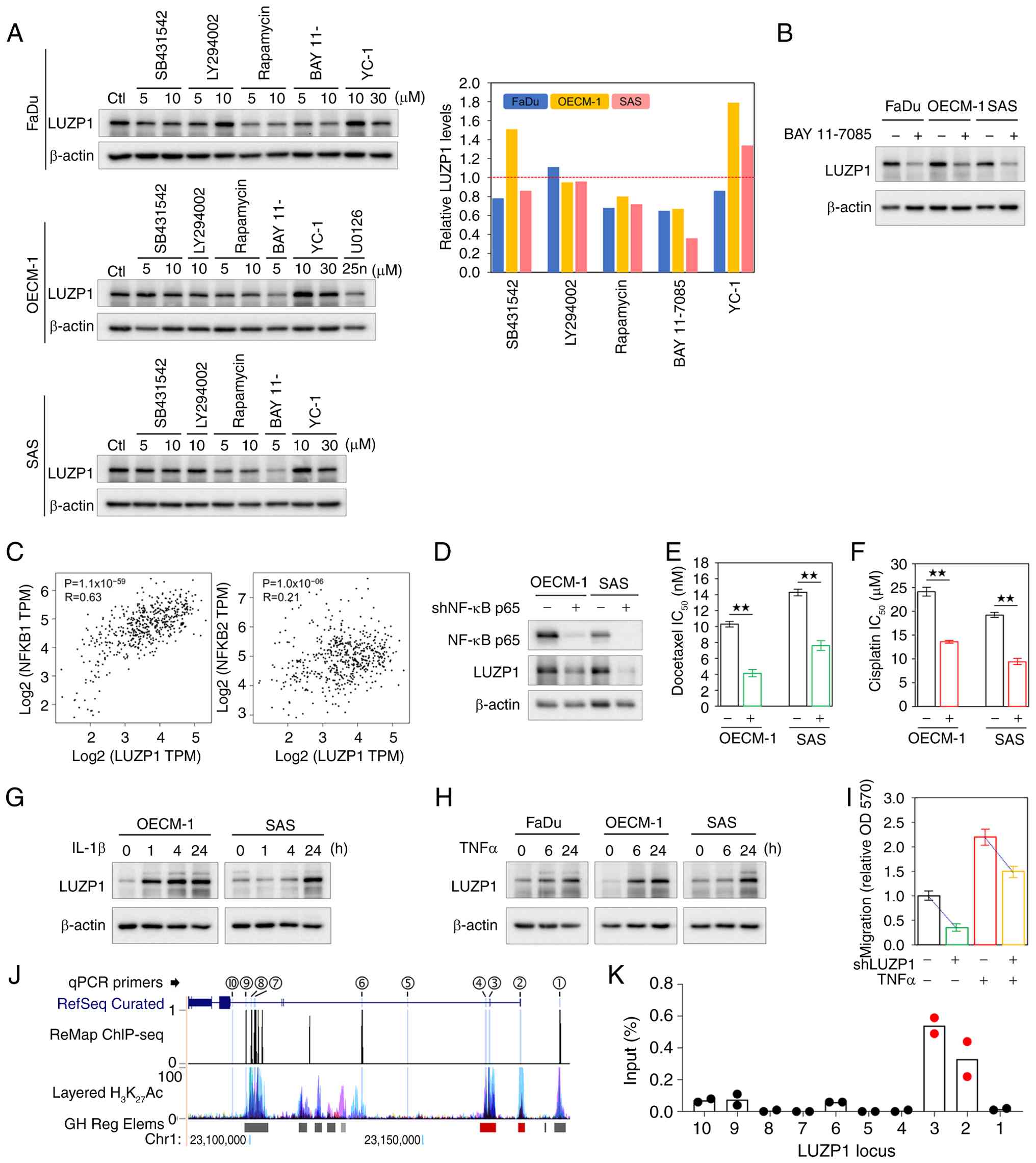 Based on the aforementioned findings, the signaling pathways associated with metastasis and chemoresistance that may regulate LUZP1 expression were investigated using pathway-specific inhibitors. A total of five inhibitors were employed in the present study, including SB431542 for the TGF-β/Smad pathway, LY294002 for PI3K/AKT/mTOR signaling, Rapamycin for mTOR, BAY 11-7085 for NF-κB signaling and YC-1 for the HIF-1 pathway. Semi-quantitative western blot analysis demonstrated that BAY 11-7085 exerted the most pronounced inhibitory effect on LUZP1 expression across all three HNSCC cells (FaDu, OECM-1 and SAS; Fig. 4A), and repeated treatments with BAY 11-7085 consistently reproduced this inhibitory effect on LUZP1 protein levels (Fig. 4B). These results suggest that LUZP1 expression may be regulated by NF-κB signaling activation. Consistently, in silico analysis using the GEPIA database revealed a significant positive correlation between LUZP1 expression and that of NF-κB p105 (NFKB1) and NF-κB p100 (NFKB2) subunits (Fig. 4C). Based on the aforementioned findings that LUZP1 knockdown increased the sensitivity of HNSCC cells to DTX and CIS (Fig. 3B and C), validation of the contribution of NF-κB-LUZP1 signaling to chemoresistance was next sought. To this end, NF-κB p65 was silenced using gene knockdown by shRNA. Western blot analysis showed that NF-κB knockdown resulted in a marked reduction of LUZP1 expression (Fig. 4D). Consistently, MTT assays demonstrated that NF-κB knockdown significantly enhanced the sensitivity of both OECM-1 and SAS cells to DTX and CIS, leading to a pronounced decrease in drug IC50 values (Fig. 4E and F). These results support that NF-κB-LUZP1 signaling may play a key role in mediating chemoresistance in HNSCC cells. To further validate the regulation of LUZP1 by NF-κB signaling, HNSCC cells were stimulated with the cytokines IL-1β and TNF-α, both known activators of NF-κB signaling (26). Western blot analysis showed that IL-1β and TNF-α both induced LUZP1 expression in a time-dependent manner (Fig. 4G and H). Moreover, to examine the functional consequences of NF-κB-mediated regulation of LUZP1, cell migration following LUZP1 knockdown and/or TNF-α stimulation was assessed. Using a two-way ANOVA to assess the effects of shLUZP1 and TNFα treatment, significant main effects of shLUZP1 (F(1,8)=68.87, P=3.35×10−5) and TNFα (F(1,8)=216.30, P=4.49×10−7) were observed, whereas the interaction term did not reach significant (F(1,8)=0.026, P=0.877) (Fig. 4I). Tukey's multiple comparisons post hoc test confirmed significant differences among all four groups (adjusted P≤0.01). The results indicated that TNF-α treatment enhanced the migratory ability of parental HNSCC cells and effectively rescued the migration defect caused by LUZP1 knockdown (Fig. 4I).