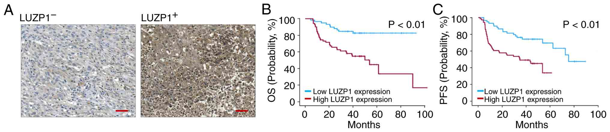 To assess the impact of LUZP1 on clinical outcomes, IHC assays were conducted in tissue specimens to determine the correlation between LUZP1 expression levels and OS and PFS in patients with HNSCC. A total of 130 pathologic specimens were collected from patients with HNSCC, with demographic information shown in Table I. Representative IHC staining images are shown in Fig. 5A. IHC signals were semi-quantitatively scored as 0, 1, 2 or 3, and a score ≥2 was defined as positive (LUZP1+), as described in the Materials and methods section. The Kaplan-Meier plot analysis revealed that LUZP1+ was significantly associated with shorter OS and PFS in the present study cohort (Fig. 5B and C).
