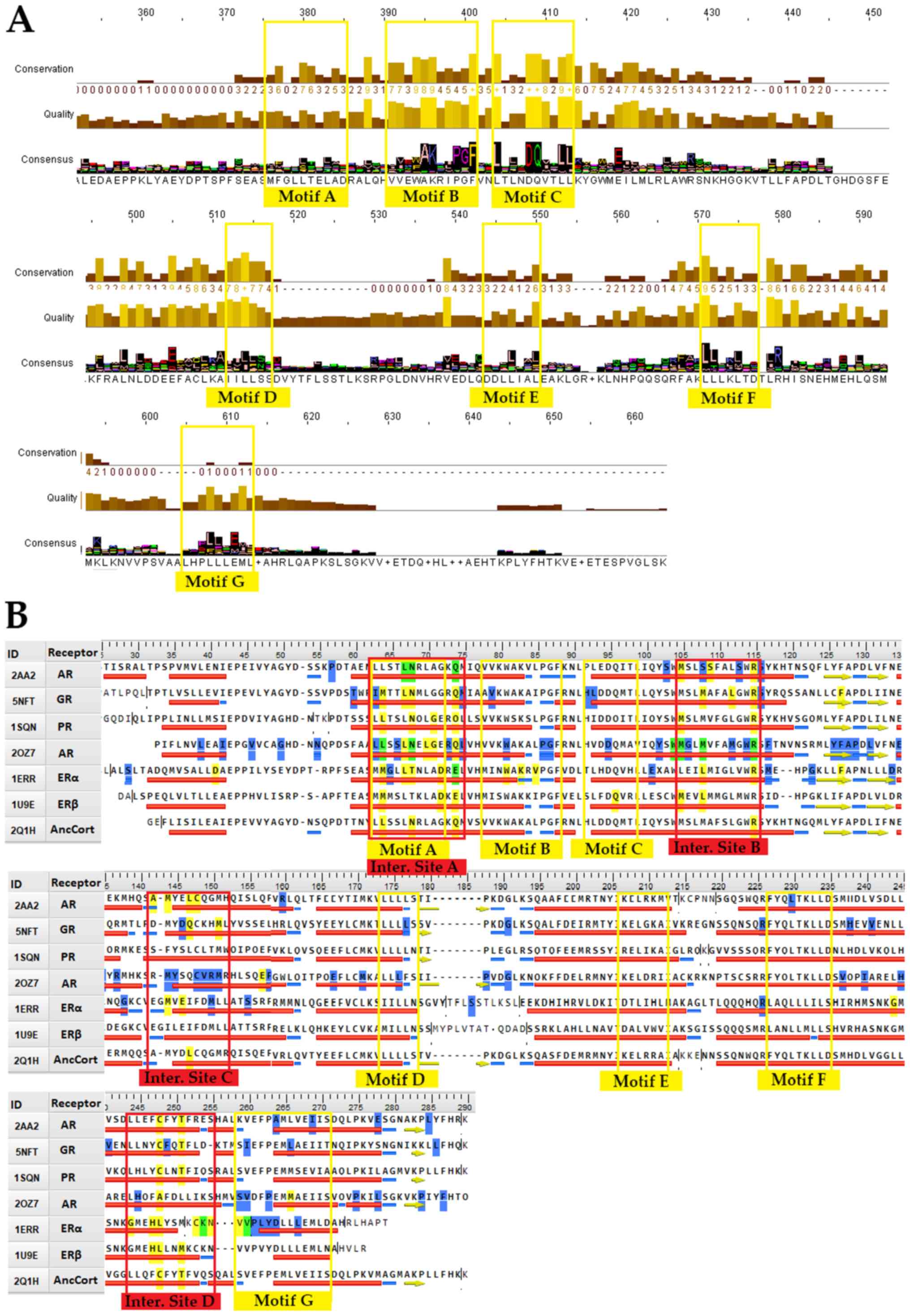 An in-depth review of the consensus sequence and NR LBD mutations provides a basis for 7 highly conserved signaling motifs (Fig. 2A). A more targeted approach to steroid hormone receptors can provide data on their importance for NR function (Fig. 2B). Motif A occupies consensus sequence positions 378 to 385 (Fig. 2A). This LLxxL motif is an inverse NR-box (LLxxL) and still contains the ability to interact with several NRs (40). Based on NCBI's conserved domain database (CDD) (41), this position is one of the main ligand interaction sites of the family and is of utmost importance to NRs. It also coincides with the SHR interaction Motif A (Fig. 2B). Motif B occupies consensus sequence positions 391 to 401 (Fig. 2A). A cross-check with CCD NR action sites (Fig. 2B) reveals that Motif B resides in a region critical to co-activator function. The GR mutation V575G does support this hypothesis (42). V575 is part of the AF-2 surface, and it contributes directly to the attraction of LxxLL (NR-box sequence motif). A mutation on that specific region hinders the ability of co-activators to interact with the NR. The 1L2I PDB entry for ERα also implies the region's high impact role in interacting with co-activators, and more specifically, the NR-box sequence motif. Motif C occupies positions 404 to 413, a region that is also critical to co-activator function (Fig. 2A). Motif C could be described as LxxDDQ. Along with the R (402 alignment position) residue, this motif creates a structure specific to GRs, ARs and PRs. The study by Bledsoe et al was the first one that recognized this specific region's critical role in LBD function (7). Motif C partakes in the creation of GR's second charge clamp. This distinct structure is vital to the binding of the third NR-box of co-activators. The residues responsible for the second charge clamp are not present in the remaining SHRs (ERs and MRs). Motif D occupies positions 512 to 516. This region is part of the highly conserved C-terminal end of the helix eight domain in SHRs, whose function is critical to ligand binding. Mutations in this motif, including GR's L672P and AR's L813P lead to a complete lack of ligand binding (43,44). More experiments also showcase that the mutant proteins are possibly prone to higher degradation (44). Motif E is an inverse NR-box and occupies positions 546 to 550. Motif F occupies positions 568 to 575. This LxxLL motif (NR-box) is found in all SHRs, with the ERα LxxLL comprising positions 568 to 572. Motif G occupies alignment positions 601-613. It contains an ERα LxxLL motif on positions 601 to 609, a PPAR LxxLL motif on positions 605 to 609, and an LLxxL ERα motif on position 609 to 611. It is quite intriguing that ERα exhibits a motif of LxxLLLxxL, which contains both an NR-box and its inverse. A prime example of a malfunctioning mutation on motif G is the Y537S, which is present on ERαs appearing in breast cancer cells (45).