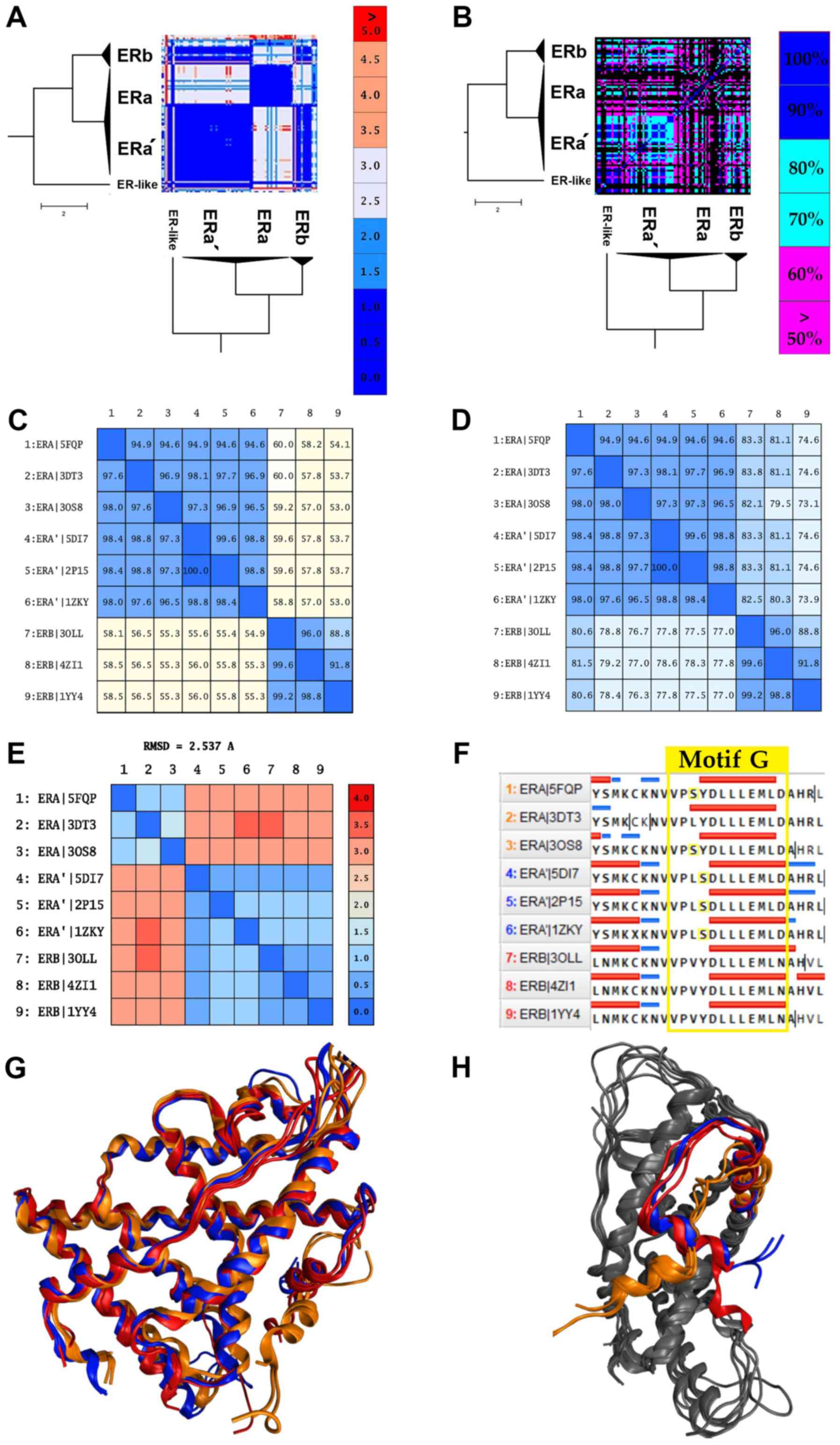 The first canonical form of ERα contains various mutant ERαs and a small number of wild-type receptors. The most common mutants in this sub-cluster are located at positions C381, C417, C530 and L536. The second canonical form of ERα, which will be referred to as ERα', is mainly characterized by the Y537S mutation. This mutation is commonly found in breast cancer patients and is associated with resistance to several endocrine therapies (49). More specifically, this mutation is located in the AF-2 helix of the ERα' LBD and shifts the receptor equilibrium towards the agonist conformation, even in the absence of a ligand (23). Moreover, the ERα' canonical form appears to be identical in the structural level with the ERβ (RMSD <2) rather than the ERα, while in the sequence level, all ERαs and ERαs' exhibit minimal differences (Fig. 5A, C, E and G). Based on these findings, the Y537S mutation induces a critical conformational change in the ERα structure. In particular, it changes the angle of the AF-2 helix of the ERα' LBD, in a position which is identified coequally on the ERβ AF-2 helix (Fig. 5H). The displacement and the 90˚ turn of the AF-2 helix plays a key role in the action of the ERα' since it contains the signaling ‘Motif G’, one of the most important motifs of the NR LBD (Fig. 5F). This hypothesis seems to be confirmed with the functional analysis we had performed by analyzing all the available ligands and chemicals that have been co-crystallized in the cavity of the ERα' and generally in all ERs. Based on these results, ERα' can interact without any specificity with all the identified ligands on ERs, including ERβ (Fig. 5B). This particularity has also been described by several studies (48-50) that are found to refer to a number of ERα' structures. In the study by Nettles et al, a member of the ERα' (PDB: 2P15) was crystallized, and it was concluded that this ERα could interact with a wider array of pharmacophores than was previously thought (50). In summary, it is possible that the Y537S mutation induces a LBD domain with higher plasticity in the ERα'.