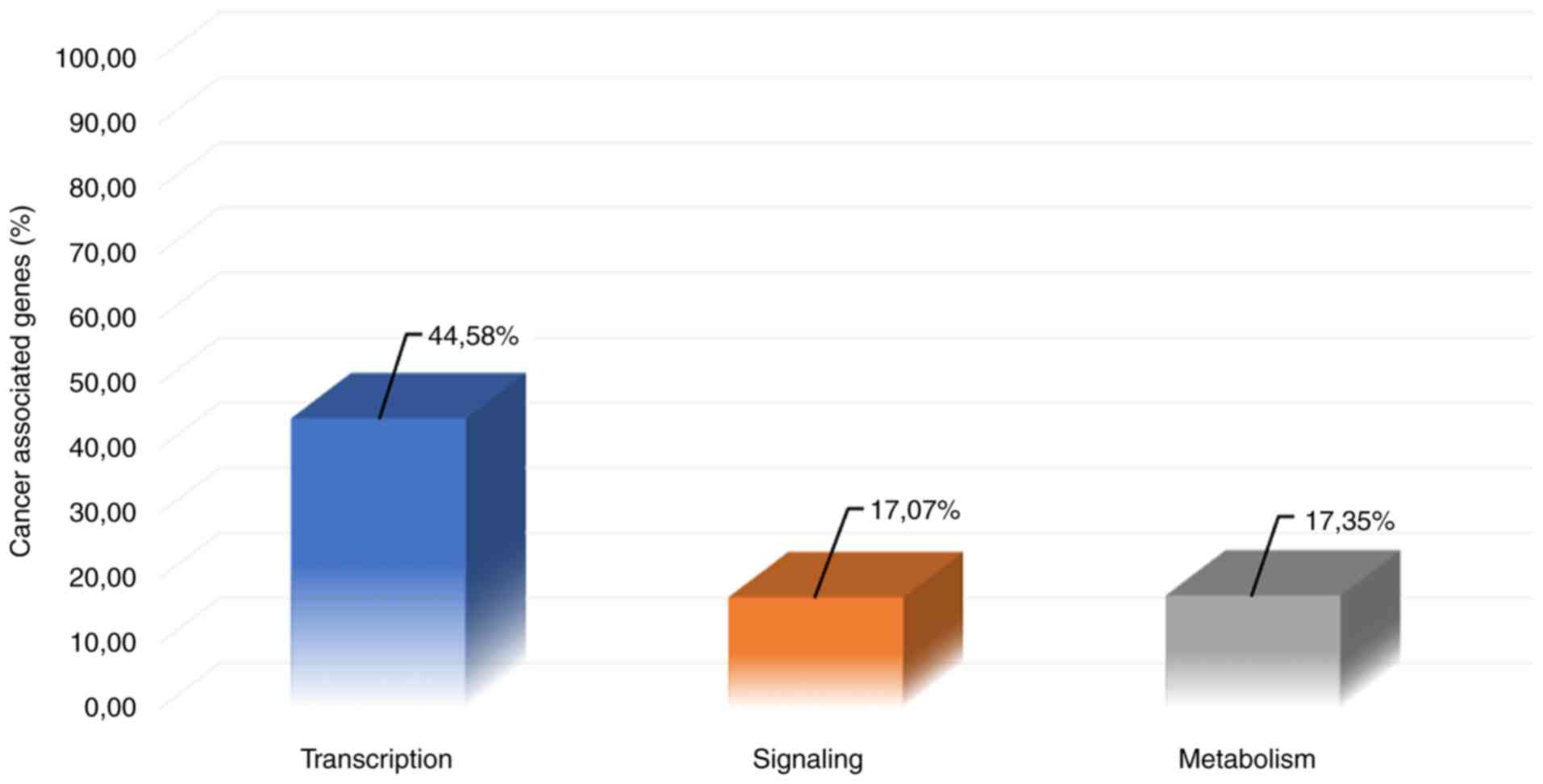 In the following sections, focus is paid on elucidating the role of ancestral genes involved in signaling, metabolism and transcription pathways as stake holders of evo-devo under the prism of reduced survival and disease through ‘cancer’. Collectively, a list of inhouse curated genes that are involved in signaling, metabolism and transcription in cancer, by harvesting the NCBI Gene Database (11) with the respective keywords and filtering out the noise, is provided in Table SI. Notably, as shown in Fig. 1, 44.58% of cancer-associated genes are involved in transcription pathways, whereas the co-occurrence of signaling- and metabolism-associated genes in cancer is 17.07 and 17.35%, respectively.