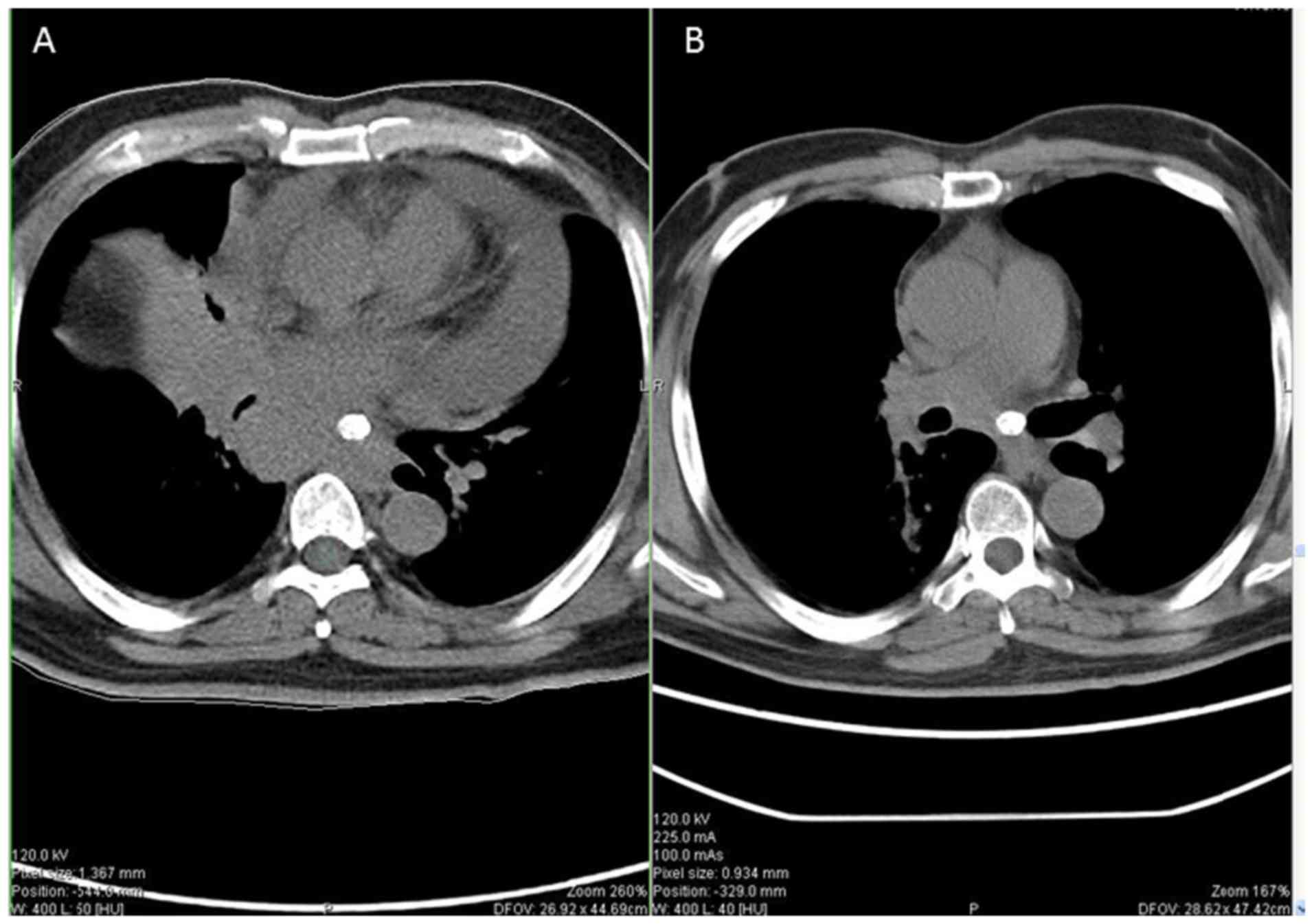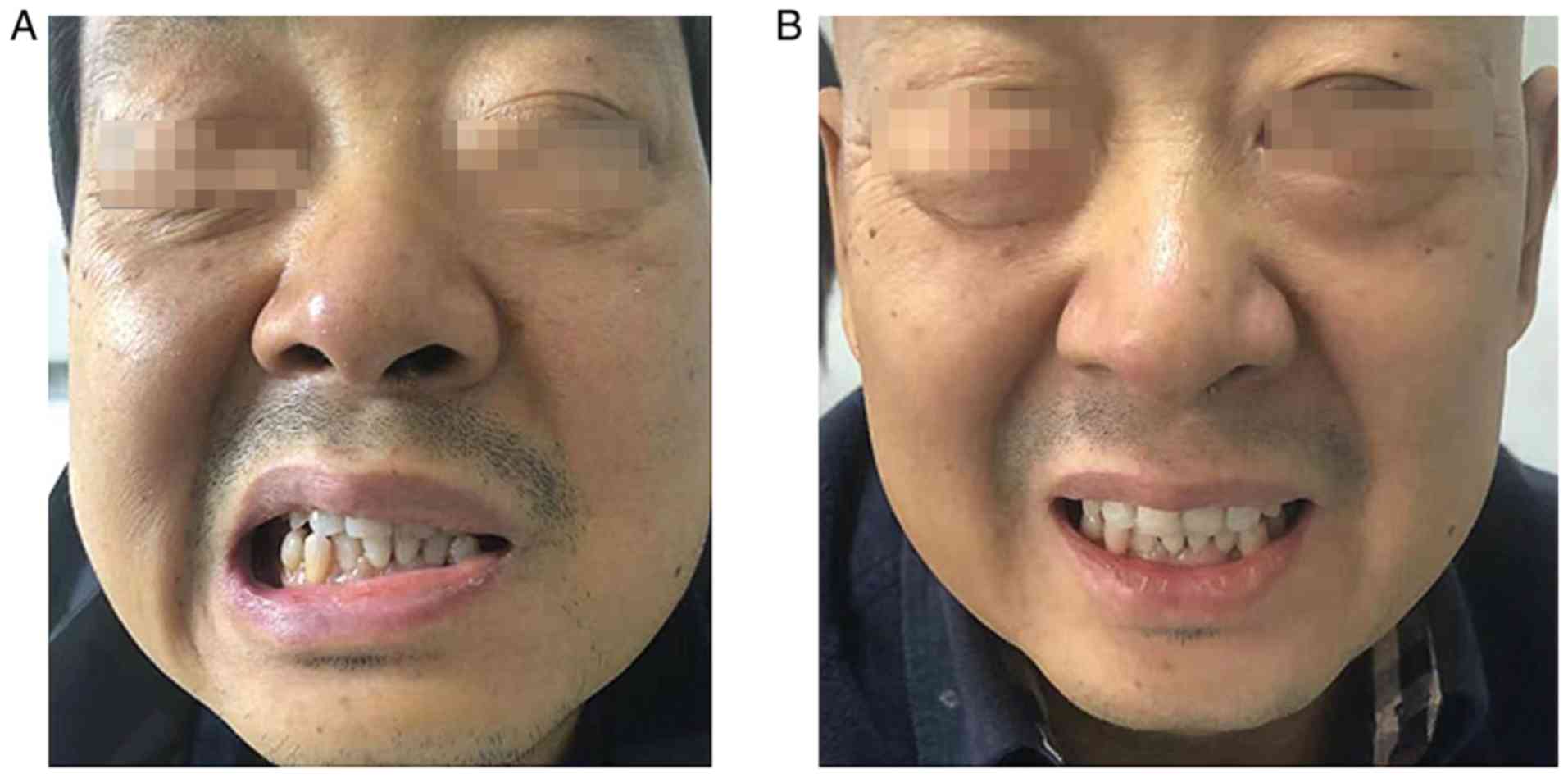 A 44-year-old male was diagnosed with extensive-stage small-cell lung cancer (ES-SCLC) accompanied by bone, brain and mediastinal lymph node metastasis. Between March, 2019 to August, 2019, he received systemic treatment with 6-cycle etoposide and cisplatin (EP) chemotherapy (etoposide 165 mg/m2 on days 1-3, and cisplatin 50 mg/m2 on days 1-2) followed by 200 mg pembrolizumab (Keytruda®, Merck Sharp & Dohme Corp.) intravenously once every 3 weeks, and the curative efficacy was evaluated as progressive disease (PD). He arose with facial paralysis, facial numbness, pain, tinnitus and limb joint pain on September 23, 2019 (Fig. 1A), although he had tendon reflexes. An enhanced cranial MRI examination revealed that there were abnormal enhancement areas in the left pontine crus, with clear boundaries (Fig. 2A). Facial nerve thickening and swelling caused facial paralysis. According to the toxicity grade, it was classified as grade 2. Thus, the use of pembrolizumab was terminated, although EP chemotherapy continued and he was treated with high-dose hormone therapy with the resolution of neurological symptoms. Methylprednisolone at 40 mg was administered for 5 days and he was then treated with oral prednisone tablets (25 mg). After 1 week, his facial symptoms were significantly alleviated (Fig. 1B). Following hormone therapy, the re-examination of the head MRI revealed that the lesion had shrunk and symptoms had improved (Fig. 2B). Subsequently, he was treated with etoposide/tenoposide alone, and he did not exhibit any signs of neurotoxicity. After completing the whole chemotherapeutic regimen, the primary tumor had markedly shrunk when comparing pre-treatment (Fig. 3A) and post-treatment (Fig. 3B).