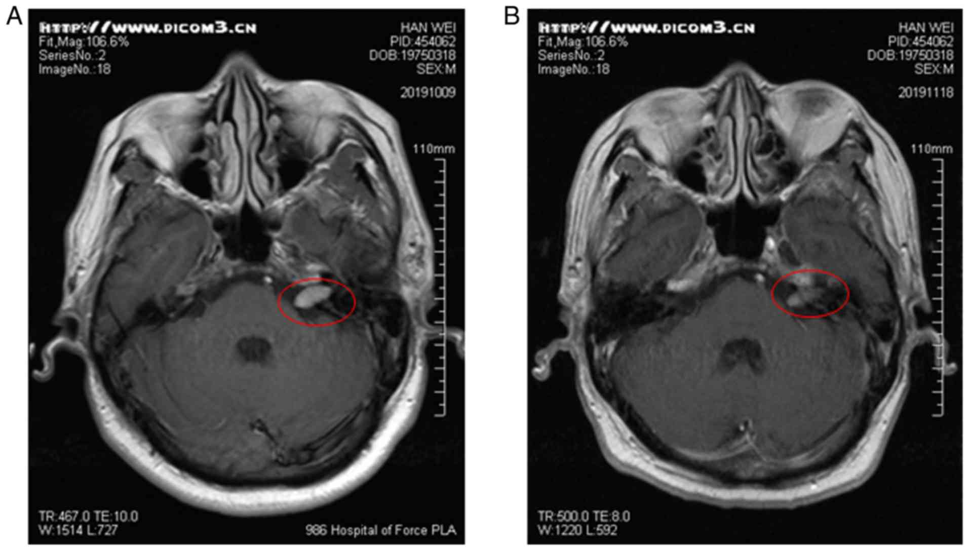 The common pembrolizumab-associated neurological immune-related adverse effects (irAEs) span diverse entities, including Guillain barre syndrome, transverse myelitis, myasthenia gravis, peripheral neuropathy and aseptic meningitis (3). The presents study reports one case of pembrolizumab-associated neurological irAEs manifesting as pain, numbness and corner nakedness in the area of left facial nerve innervation, no tinnitus and hearing loss. When enquiring about the detailed history of the patient, a comprehensive detection of the nervous system, brain MRI, a cerebrospinal fluid examination, neurological analysis and consultation with a neurologist, tumor progression, transfer, central nervous system infection, diabetic neuropathy, or vitamin B12 deficiency-associated disease were excluded. Given the specification of glucocorticoid treatment underlying neurotoxicity, the symptoms and related image data markedly improved, and the patient was considered to have suffered from facial nerve toxicity caused by pembrolizumab. It has been reported that pembrolizumab-associated neurological irAEs occur both in peripheral neuropathy and Guillain barre syndrome (5), although facial nerve injury is rare. The present case report demonstrated that there were marked individual differences in immune-related neurotoxic manifestations, which increases the difficulty in the early identification of toxic symptoms. The facial nerve is responsible for muscle movements in the face, and pembrolizumab-associated neurological irAEs cause facial deformation.