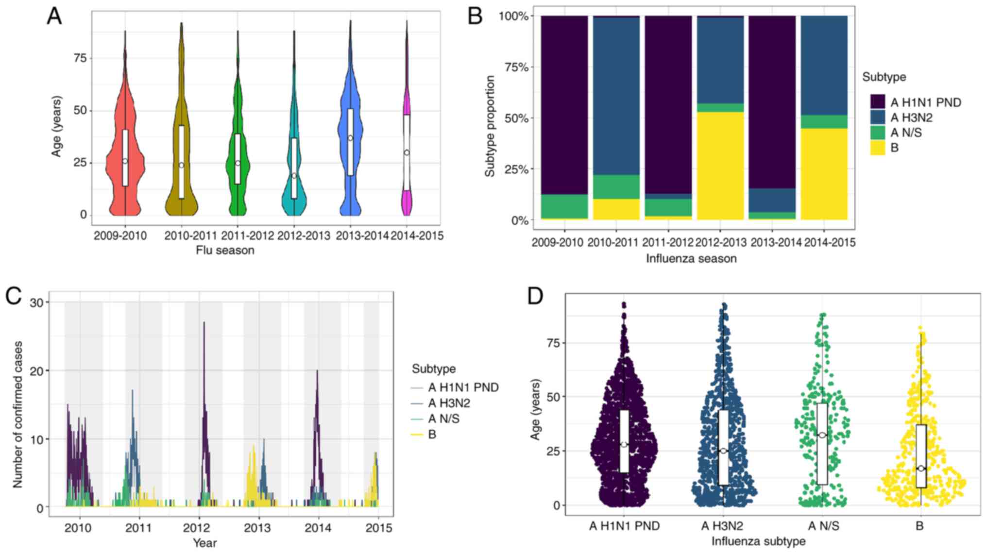 Due to the 2009 pandemic, the most prevalent influenza subtype in the 2009-2010 season was pandemic influenza A virus H1N1 subtype (Fig. 2B). It was replaced predominantly by influenza A virus H3N2 subtype in the 2010-2011 season, and it returned in the 2011-2012 season. Interestingly, influenza B predominated in season 2012-2013 (53% of confirmed cases). Pandemic influenza A virus H1N1 subtype caused 85% of the confirmed cases in the 2013-2014 season. Influenza A virus H3N2 subtype and influenza B virus shared the 2014-2015 season in a similar proportion (Fig. 2B).