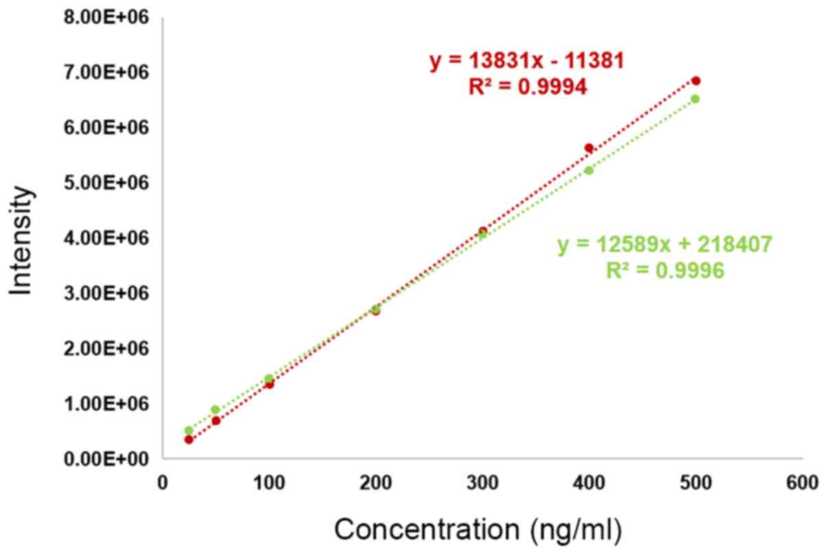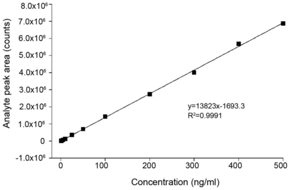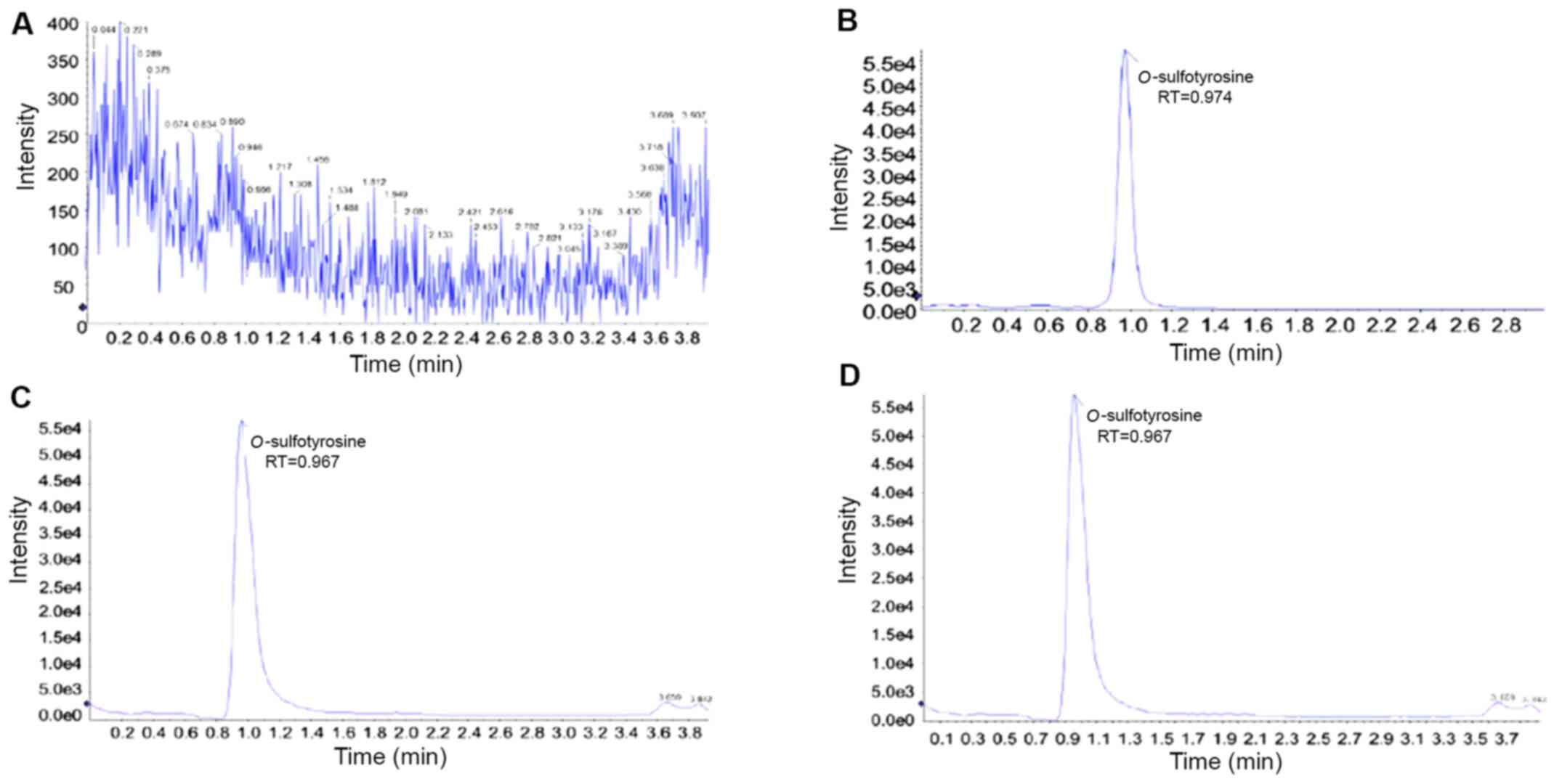 In conclusion, the present study presents an applicable, reproducible and sensitive method for the relative quantitative analysis of human plasma O-sulfotyrosine levels using HPLC-MS/MS in a linear negative ion mode. The current method requires a short chromatographic run time, a rapid sample preparation process and a small volume of plasma necessary for the analysis. However, as an external standard method, it generates some accidental and systemic errors due to the standard substance and the sample to be tested are tested independently, and the standard substance matrix differs from the sample to be tested. Therefore, in future experiments, a method of isotope internal standard should be used to create absolute quantitative detection.