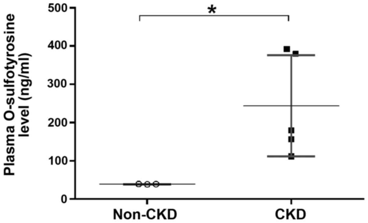 Plasma O-sulfotyrosine level is significantly increased in patients with CKD compared to those without CKD (non-CKD). *P<0.05. CKD,chronic kidney disease.