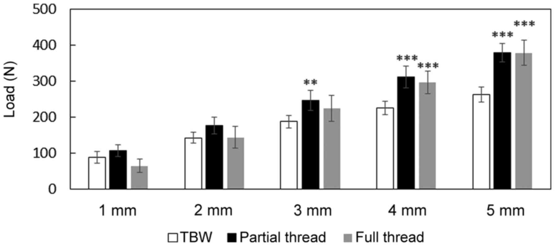 As regards the compression load parallel to the fracture line, the partial thread screw group exhibited a significantly higher compression load than the TBW group between 3 and 5 mm (3 mm: TBW, 187±18 N; partial thread, 245±28 N; 4 mm: TBW, 225±18 N; partial thread, 310±30 N; 5 mm: TBW, 262±20 N; partial thread, 378±25 N; P<0.01). The compression load parallel to the fracture line at 4 and 5 mm of fracture displacement in the full thread screw group was significantly higher than that in the TBW group (full thread: 4 mm, 295±32 N; 5 mm, 378±34 N; P<0.001). There were no significant differences in the compression load parallel to the fracture line at 1 and 2 mm of fracture displacement between the TBW group and the partial or full thread screw groups (Fig. 4). No breakage of the F-u-HA/PLLA screws or TBW was observed when the gap between fractures reached 5 mm.