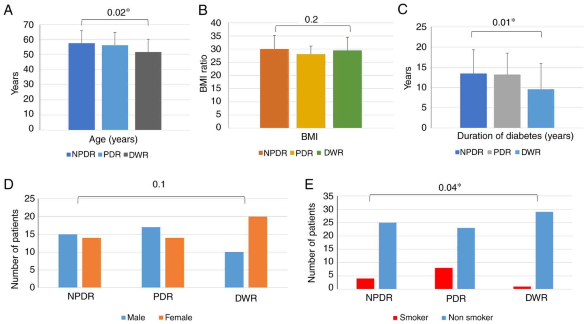 The differences between the PDR, NPDR and DWR groups were analyzed. Statistically significant differences were found for age, the duration of diabetes and smoking status between these groups, whereas the mean values of BMI and sex did not exhibit any significant differences between the groups (Fig. 1).