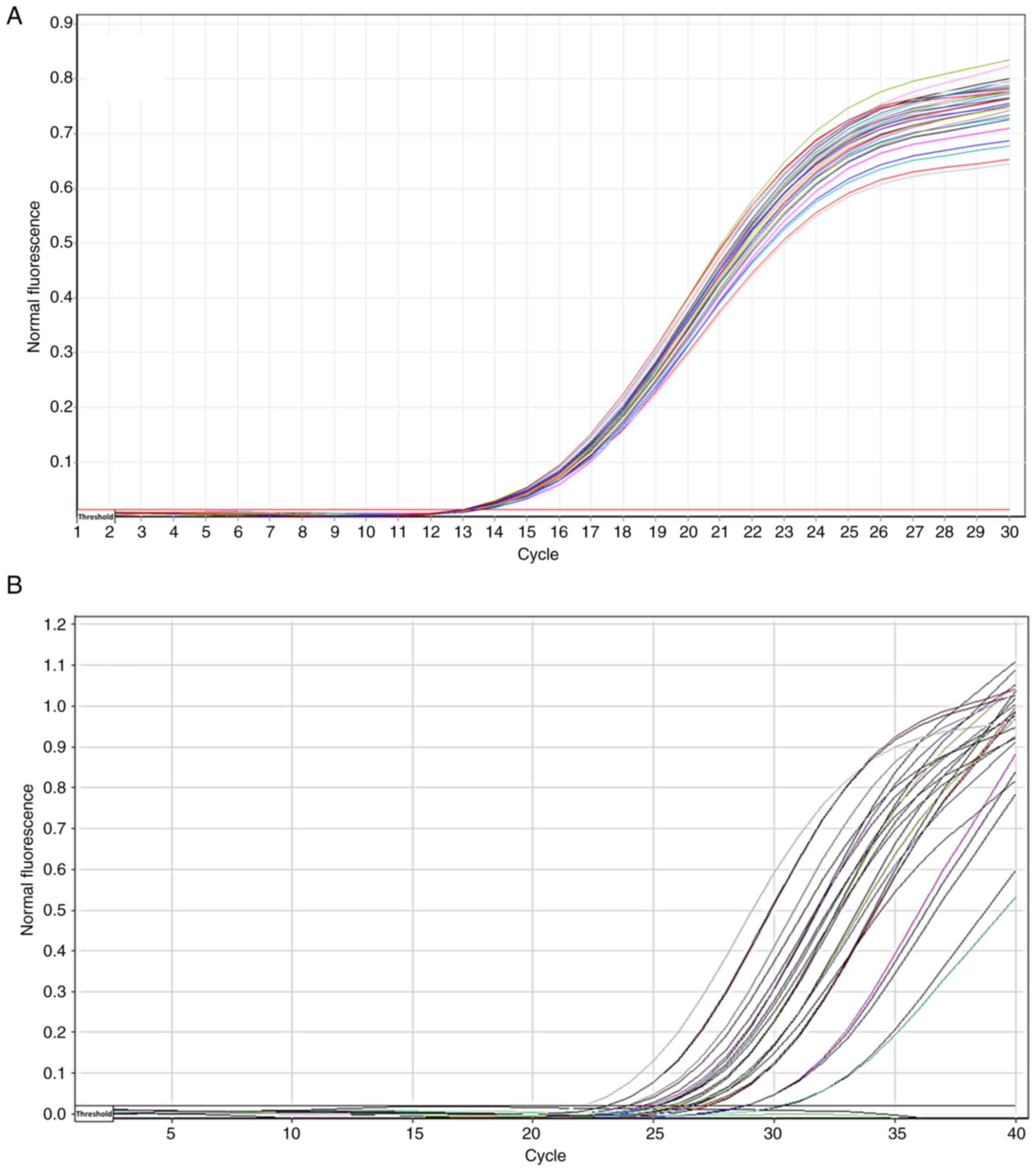 The amplification plots of GAPDH and NFE2L2 mRNA expression were determined as a Cq value (Fig. 2). A lower Cq value indicated the presence of larger copies of the target, whereas a higher Cq value indicated the presence of smaller copies. As regards gene expression, high Cq values indicate low expression, and low Cq values indicates a high expression (Fig. 2).