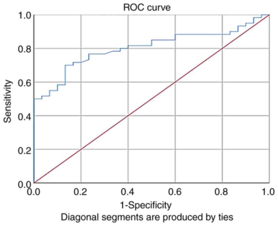 Data were analyzed using SPSS version 25 software (IBM Corp.). The Shapiro-Wilk test was used to test the normality of the results. Continuous variables are expressed as the mean ± SD, while numbers and frequencies were used for presenting categorical data. For normally distributed data, one-way analysis of variance (ANOVA) was utilized for more than two groups for continuous variables. When the latter test results were significant, a post-hoc analysis was performed with Duncan's multiple range test. Fisher's exact or Chi-squared tests were utilized to measure the group differences between categorical variables. Pearson's correlation analysis was performed and the correlation coefficient (R) was used to calculate the correlation between parameters. Receiver operation characteristic curve (ROC curve) analysis was also used. A P-value <0.05 was considered to indicate a statistically significant difference.