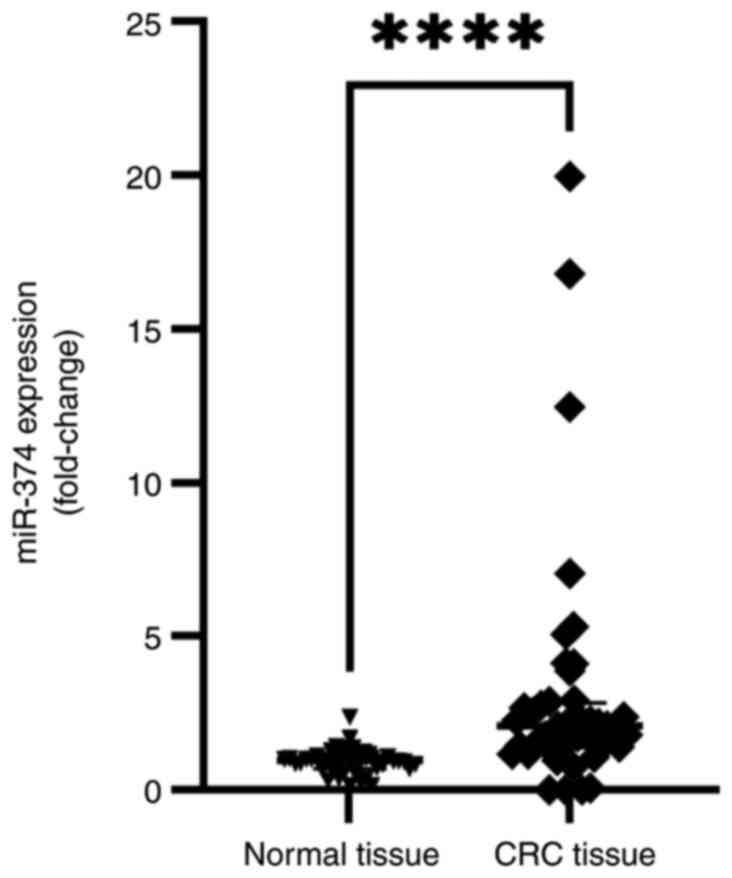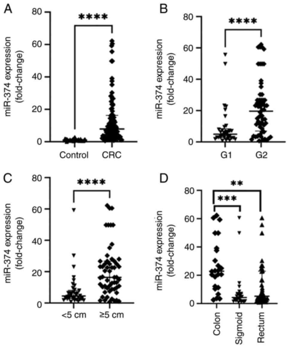 miR-374 gene expression in colorectal cancer patient blood samples.