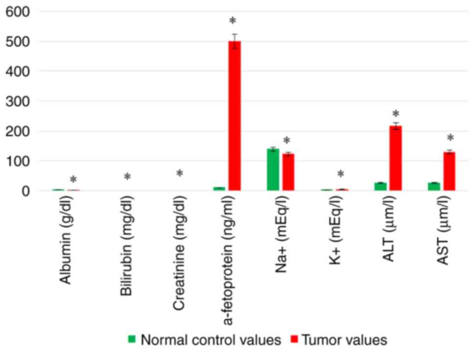 Compared to previous findings, the present study demonstrated that 40% of the patients were in stage I, while in another study, only 4.6% of patients had stage I disease (21). The present study conducted the radiological analysis of patients with liver cancer using CT scan and abdominal ultrasound. It was revealed that 85% of the patients had large-sized tumors and the remaining 15% had smaller-sized tumor. To a certain extent, these results are in accordance with the findings of another study where 25% of the liver cancer lesions are <3 cm and 50% of the tumors were >3 cm in diameter (22). The present study found that fatty liver cirrhosis comprised 50% of the cases, HBV comprised 10% and HCV comprised 40% of the cases. Of note, in another study, 95.7% of the cases had HCV or HBV infection, with the incidence of HCV predominating (91.4%) (23). Egypt has the highest HCV prevalence rate worldwide, with rates of 6 to 28% (23). The hematological findings of patients with liver cancer have been demonstrated in previous studies (24-26); in these patients, RBCs, the PLT count and Hb content were significantly decreased compared to normal values, while the number of WBCs was significantly increased (24-26). Previous studies (27,28) have confirmed the biochemical observations of the present study where, serum Alb and sodium levels were significantly decreased in the serum of patients with liver cancer compared to normal values. However, the values of serum T.Bil, serum Creat, potassium, serum AFP, serum ALT, AST and the plasma INR were all significantly elevated and this finding has been corroborated by previous studies (29-34).