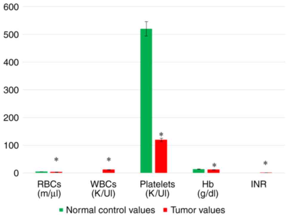 Biochemical analysis of the patients with liver cancer included chemical and hematological analyses. Chemical analysis revealed a significant decrease in both serum Alb and Na+ levels. A significant increase in serum Bil, Creat, K+, AFP, ALT and AST levels was recorded in the tumor tissues compared with the normal tissues (Table VII and Fig. 1). Hematological parameters included CBC and INR analyses of the patients with liver cancer. The CBC analyses exhibited a significant decrease in the RBC count, PLT count and Hb content in the tumor tissues compared with the normal control values, whereas the WBC count was significantly increased in the tumor tissues compared with the normal tissues. Moreover, the INR level exhibited a significant increase in the tumor tissues (Table VII and Fig. 2).
