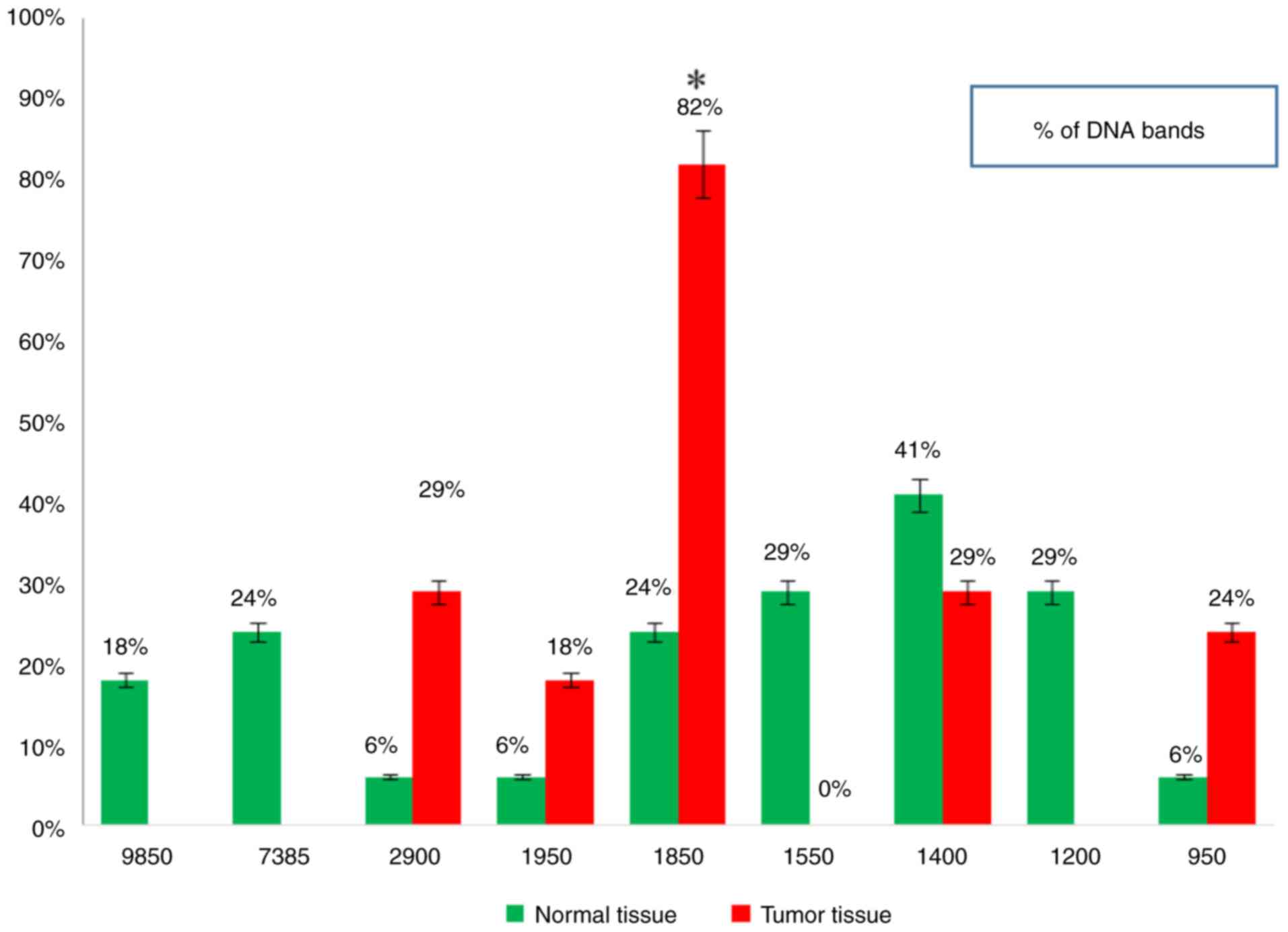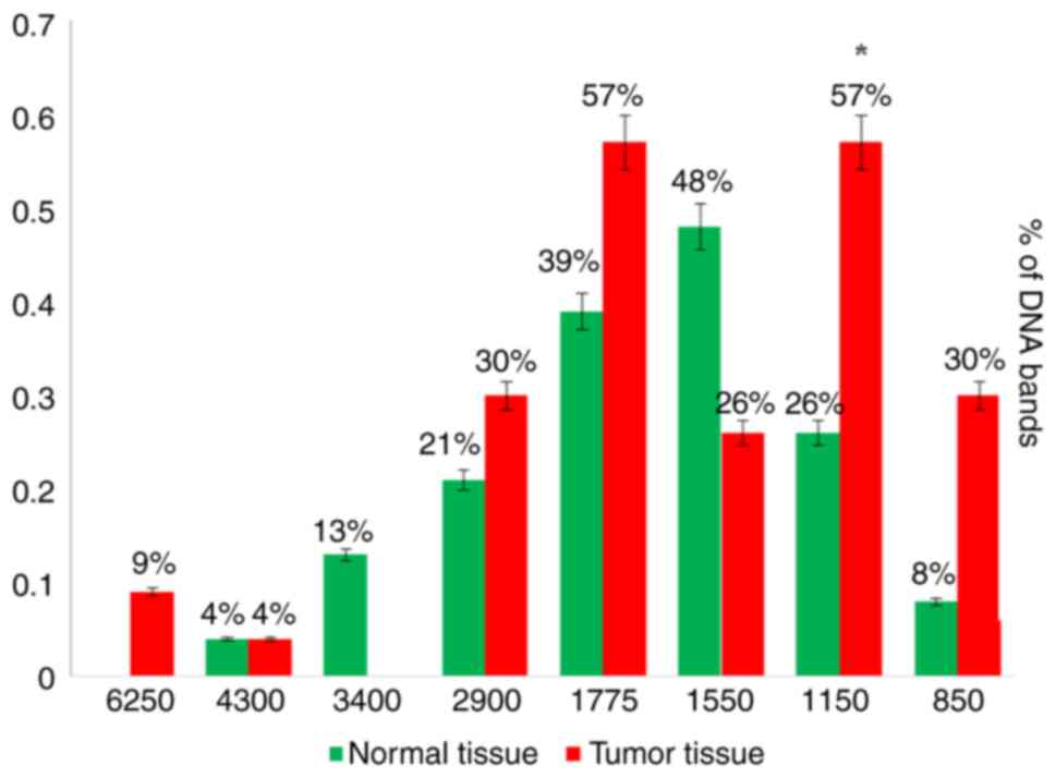 In the present study, the RAPD-PCR analysis of the tumors of patients with liver cancer and normal tissues by using the A-01 primer revealed promising results, when a distinctive significant appearance (P=0.036071) of a tumor marker band of 1,150 bp appeared in 26% of the normal tissue samples and in 57% of tumor tissue samples. Another notable result was observed with the A-03 primer, where a highly significant appearance (P=0.000591) of a tumor marker band of 1,850 bp was observed in 24% of the normal tissue samples and in 82% of the tumor tissue samples. A number of DNA bands appeared in the tumor and/or normal tissues; however, none of these produced any significant findings.