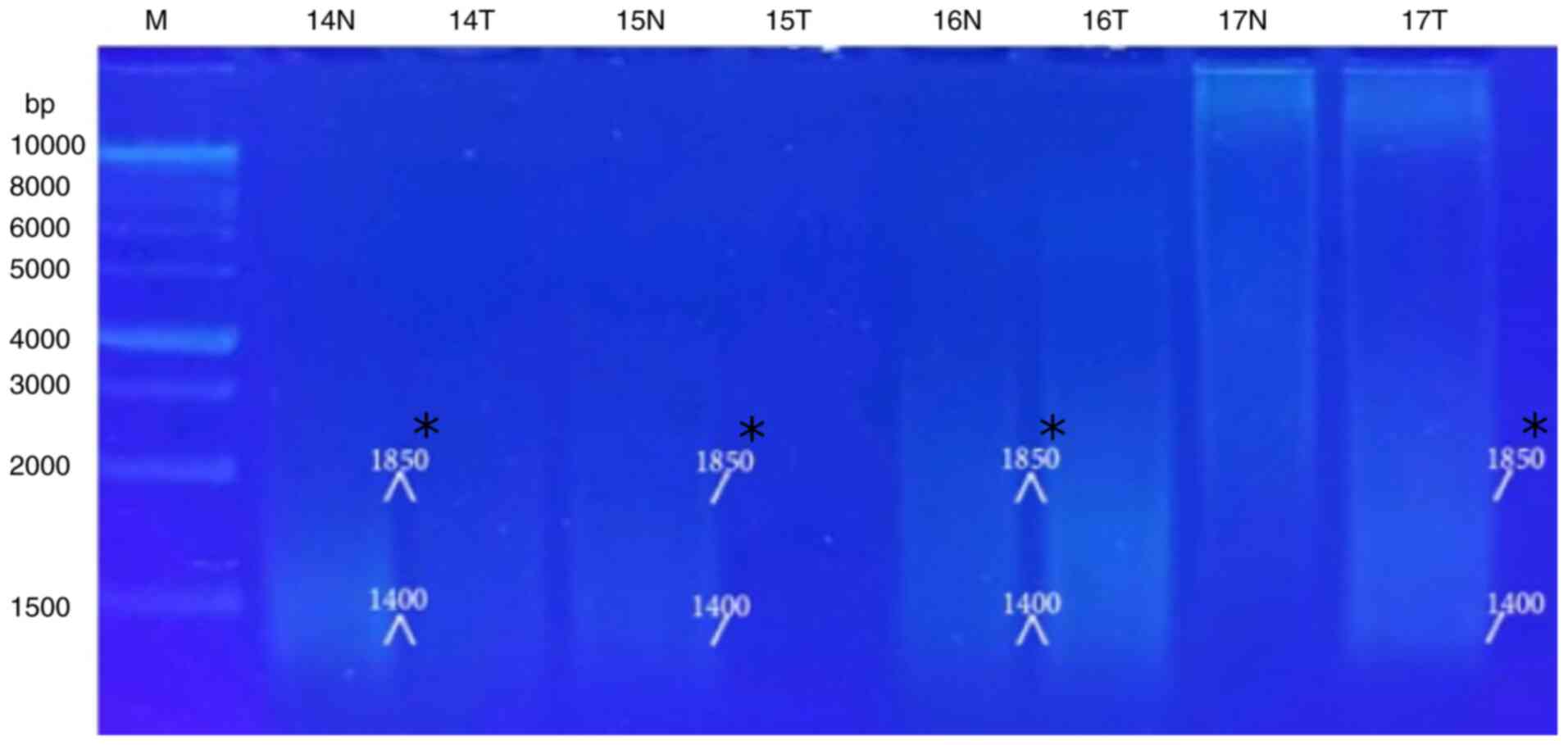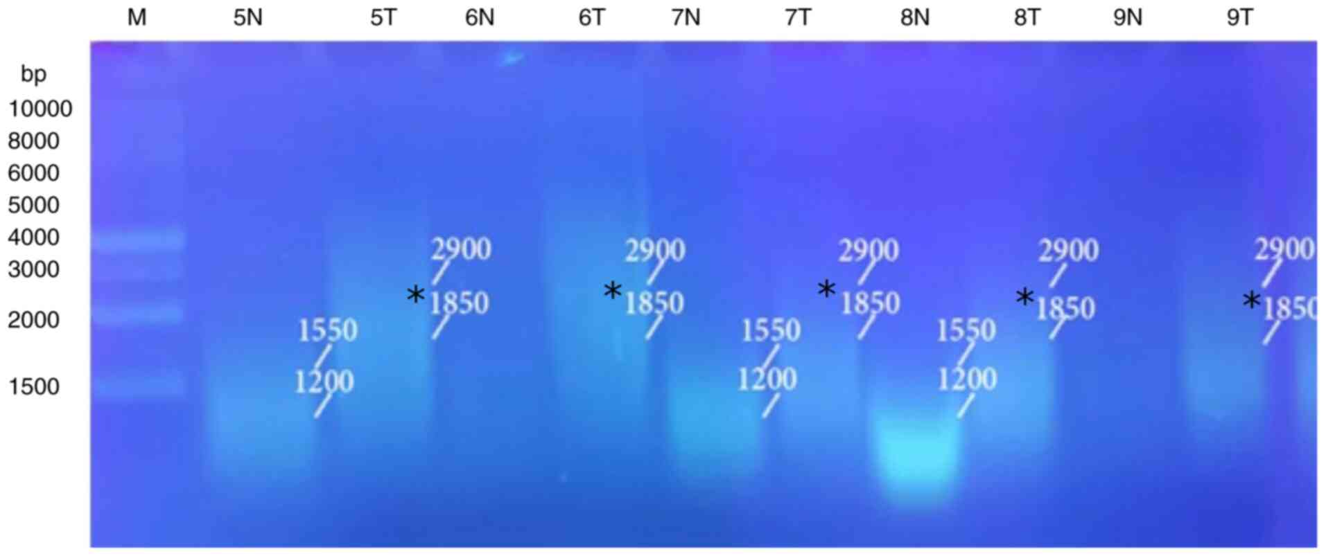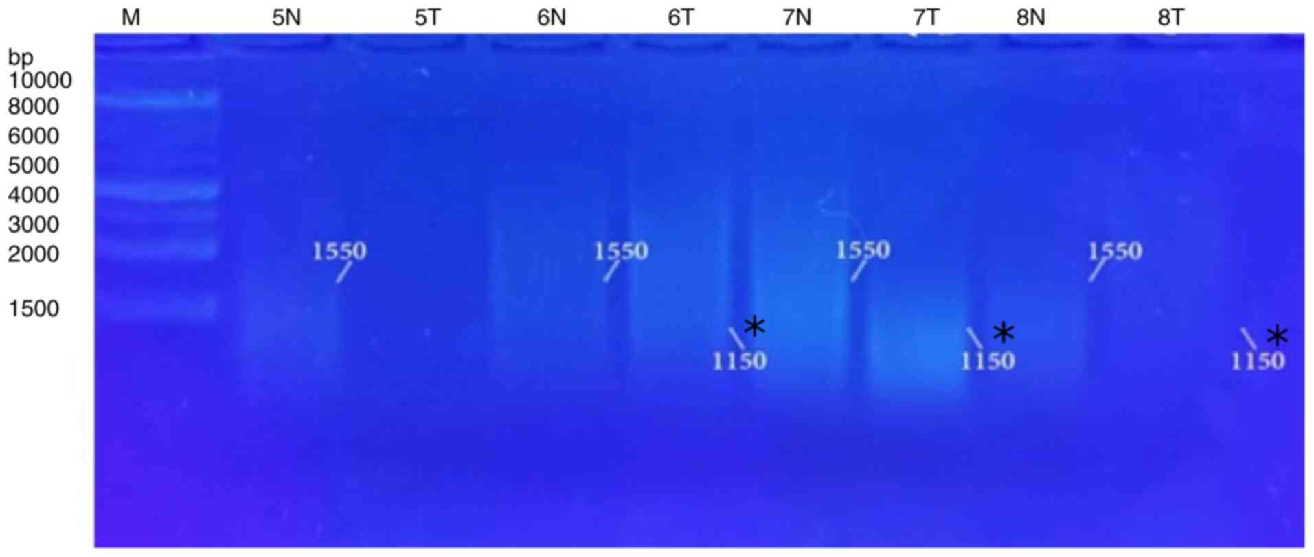 GraphPad Prism 5.0 software (Dotmatics) was used for all statistical analyses. The results were presented as the mean ± the standard error of the mean (SEM) (n=6), where n is the number of patients in each group. One-way analysis of variance (ANOVA) was used to perform statistical comparisons followed by the Student-Newman-Keuls post hoc test (16). The Chi-squared test and Fisher's exact test (<20 cases) were used to analyze the association between genomic instability, histological type and the grade of liver cancer. A value of P<0.05 was considered to indicate a statistically significant difference. The GellApp analyzer program was used to determine the molecular weight of the amplified DNA fragments including normal and tumor DNA bands by plotting a curve illustrating the detected fragment molecular weight against the molecular weight of the marker fragments.