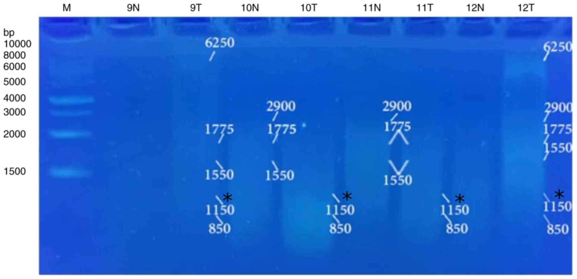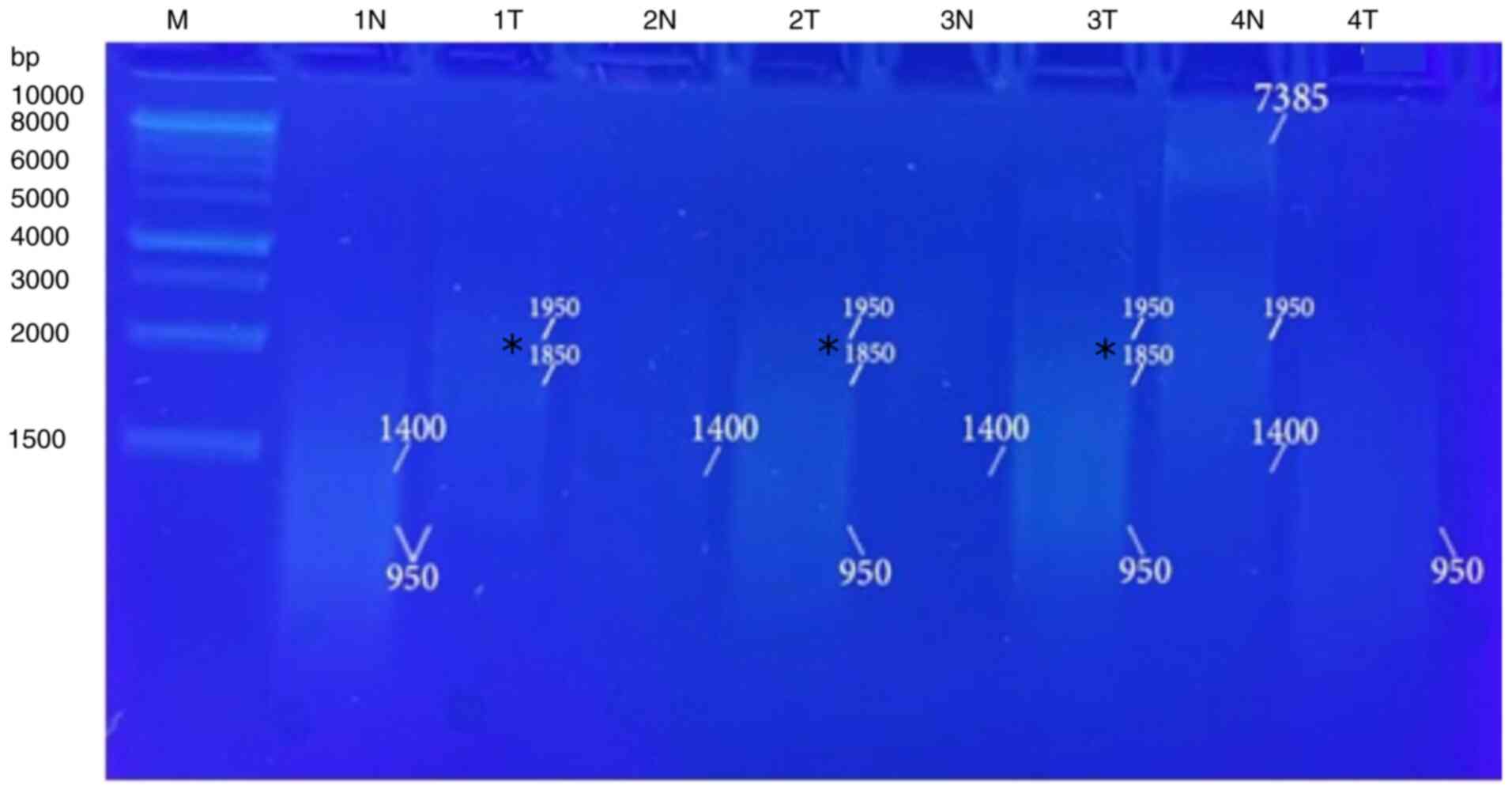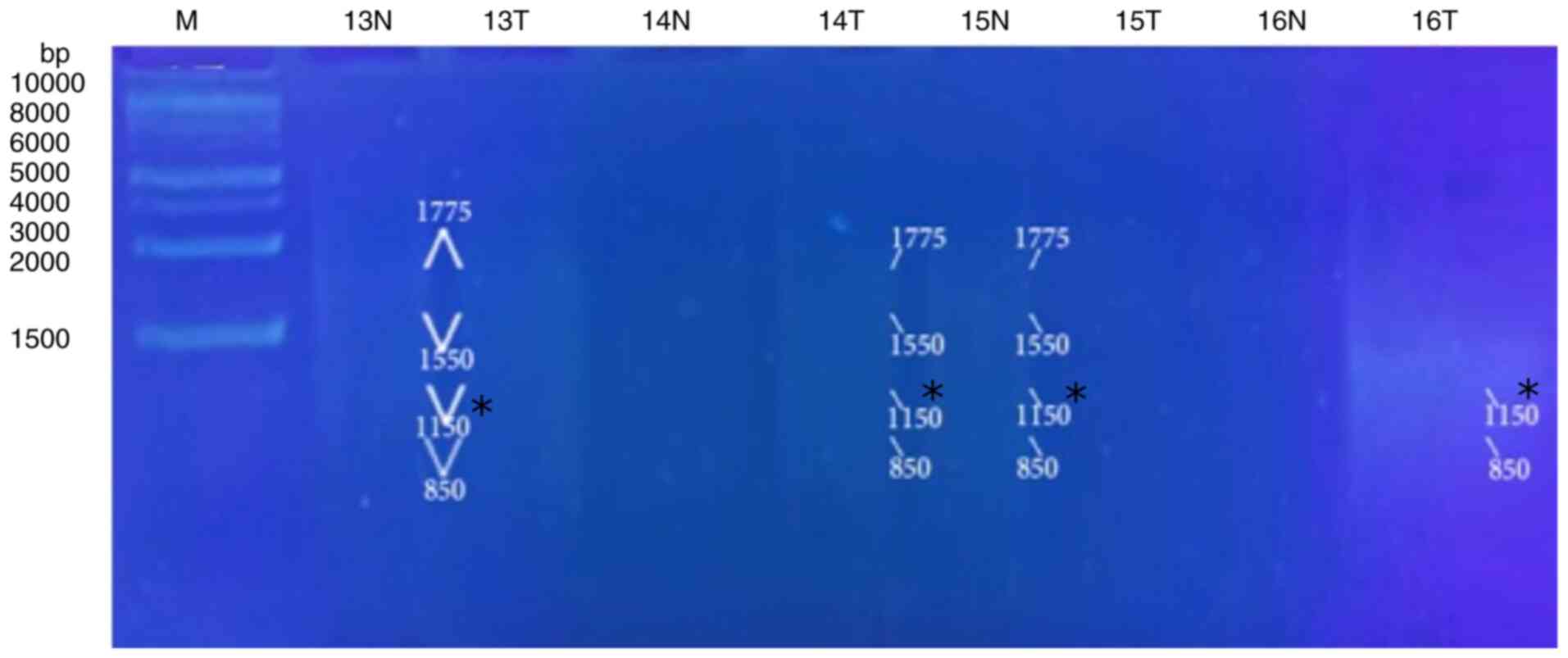 GraphPad Prism 5.0 software (Dotmatics) was used for all statistical analyses. The results were presented as the mean ± the standard error of the mean (SEM) (n=6), where n is the number of patients in each group. One-way analysis of variance (ANOVA) was used to perform statistical comparisons followed by the Student-Newman-Keuls post hoc test (16). The Chi-squared test and Fisher's exact test (<20 cases) were used to analyze the association between genomic instability, histological type and the grade of liver cancer. A value of P<0.05 was considered to indicate a statistically significant difference. The GellApp analyzer program was used to determine the molecular weight of the amplified DNA fragments including normal and tumor DNA bands by plotting a curve illustrating the detected fragment molecular weight against the molecular weight of the marker fragments.