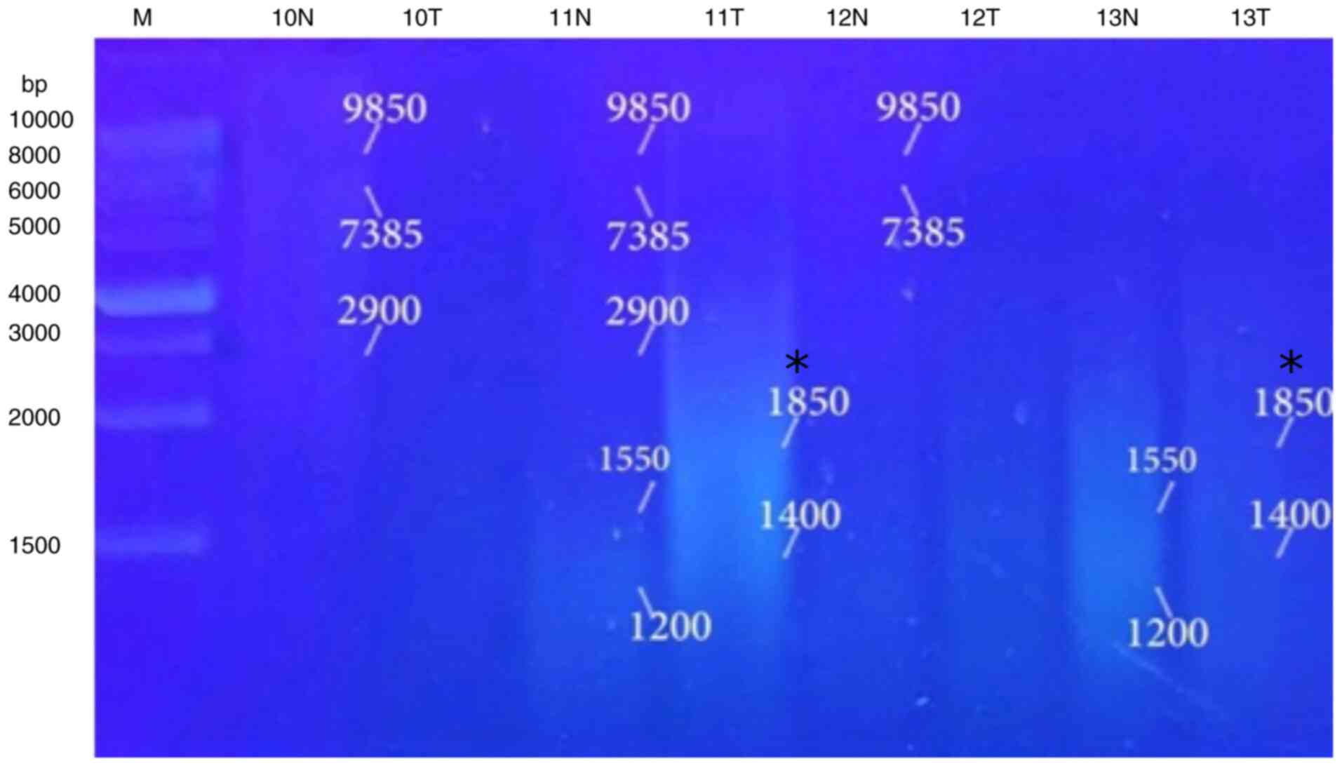 The results of molecular analysis included extracted genomic DNA profile and RAPD-PCR pattern profile. Purified extracted DNA of the patients with liver cancer was run on 0.7% agarose gels (Fig. 3). RAPD-PCR was used for analysis with five distinct primers of A-01 to A-05 (Table I). Two primers (A-01 and A-03) were amplified and presented clear and firm bands with the majority of the tested samples. The A-01 primer revealed several bands and eliminated others when used in the RAPD-PCR approach. A 6,250-bp band was observed in 9% of the tumor tissue samples and was completely absent in all the normal tissue samples. While it was presented in 13% of all the normal tissue samples, the 3,400-bp band was completely absent from all the malignant tissue samples. In 4, 21, 39, 48 and 8%, respectively of the normal tissue samples, and in 4, 30, 57, 26 and 30%, respectively of the tumor tissue samples, five common bands 4,300, 2,900, 1,775, 1,550 and 850 bp were observed. A distinctive significant appearance (P=0.036071) of a tumor marker band of 1,150 bp in 26% of the normal tissue samples, and in 57% of the tumor tissue samples was noted (Fig. 4, Fig. 5, Fig. 6, Fig. 7 and Fig. 8 and Table VIII). When primer the A-03 was employed in the RAPD-PCR approach, four bands of 9,850, 7,385, 1,550 and 1,200 bp were detected in 18, 24, 29 and 29%, respectively of all the normal tissue samples however; they were completely absent from all malignant tissue samples. The four common bands 2,900, 1,950, 1,400 and 950 bp were found in 6, 6, 41 and 6 of the normal tissue samples, respectively, and in 29, 18, 29 and 24% of the tumor tissue samples, respectively. A highly significant appearance (P=0.000591) of a tumor marker band of 1,850 bp was observed in 24% of the normal tissue samples, and in 82% of the tumor tissue samples (Fig. 9, Fig. 10, Fig. 11, Fig. 12 and Fig. 13 and Table IX).