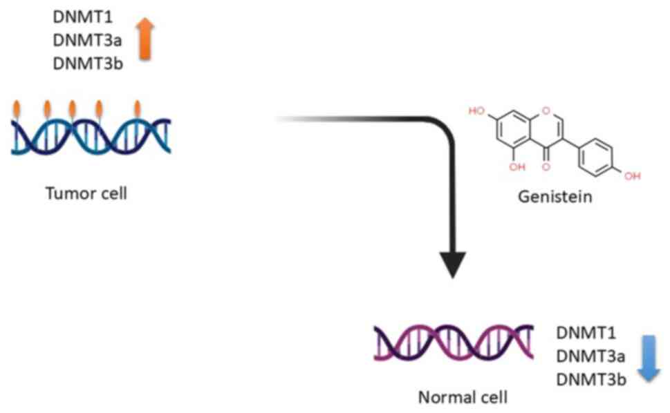 Chang H, Yi L, Zhu JD and Mi MT: Genistein inhibits DNA methylation